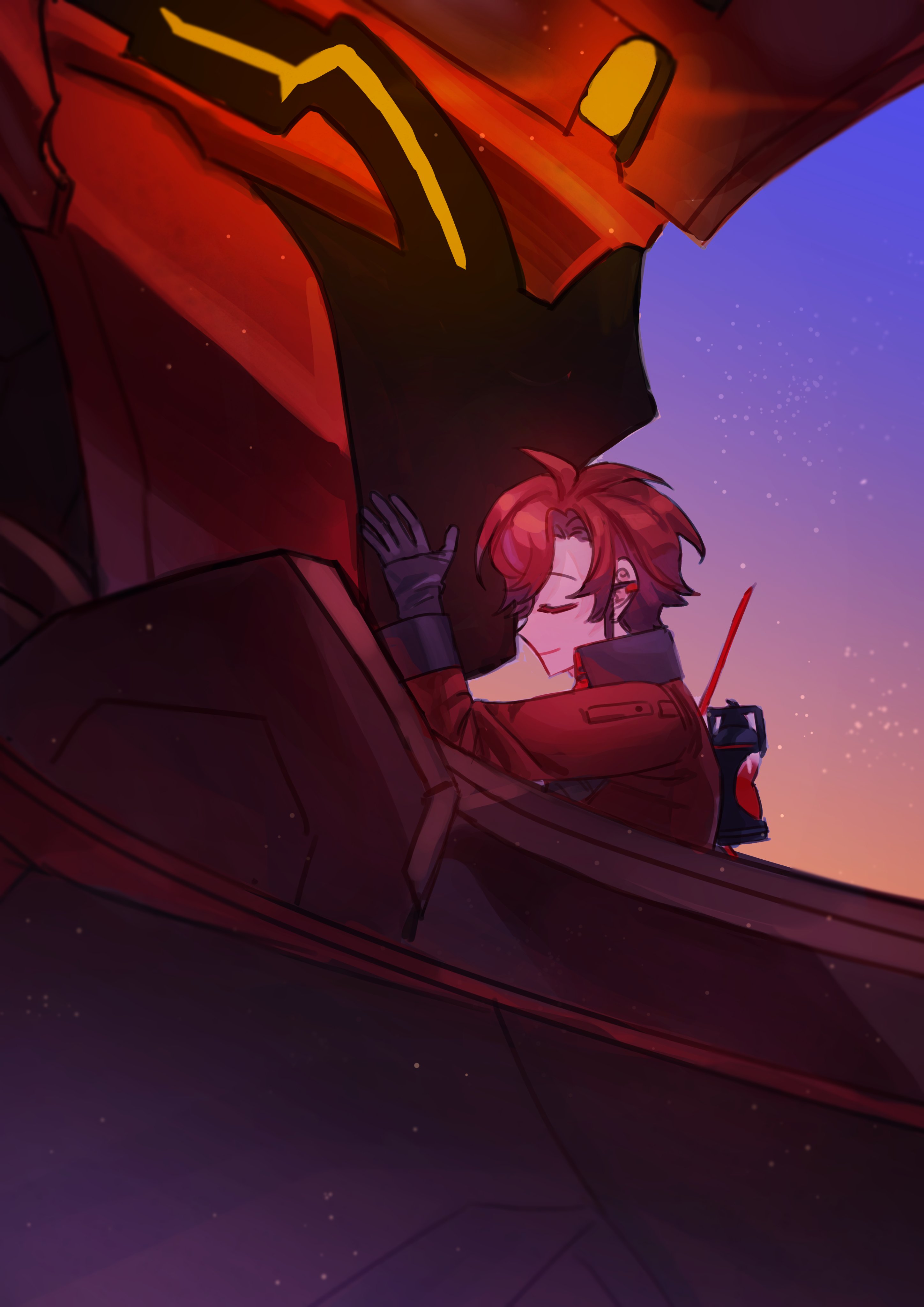 1boy absurdres backpack bag black_gloves closed_eyes gloves highres holoboisart holostars holostars_english machina_x_flayon mecha r-trus_(machina_x_flayon) red_hair red_shirt robot shirt star_(sky) virtual_youtuber