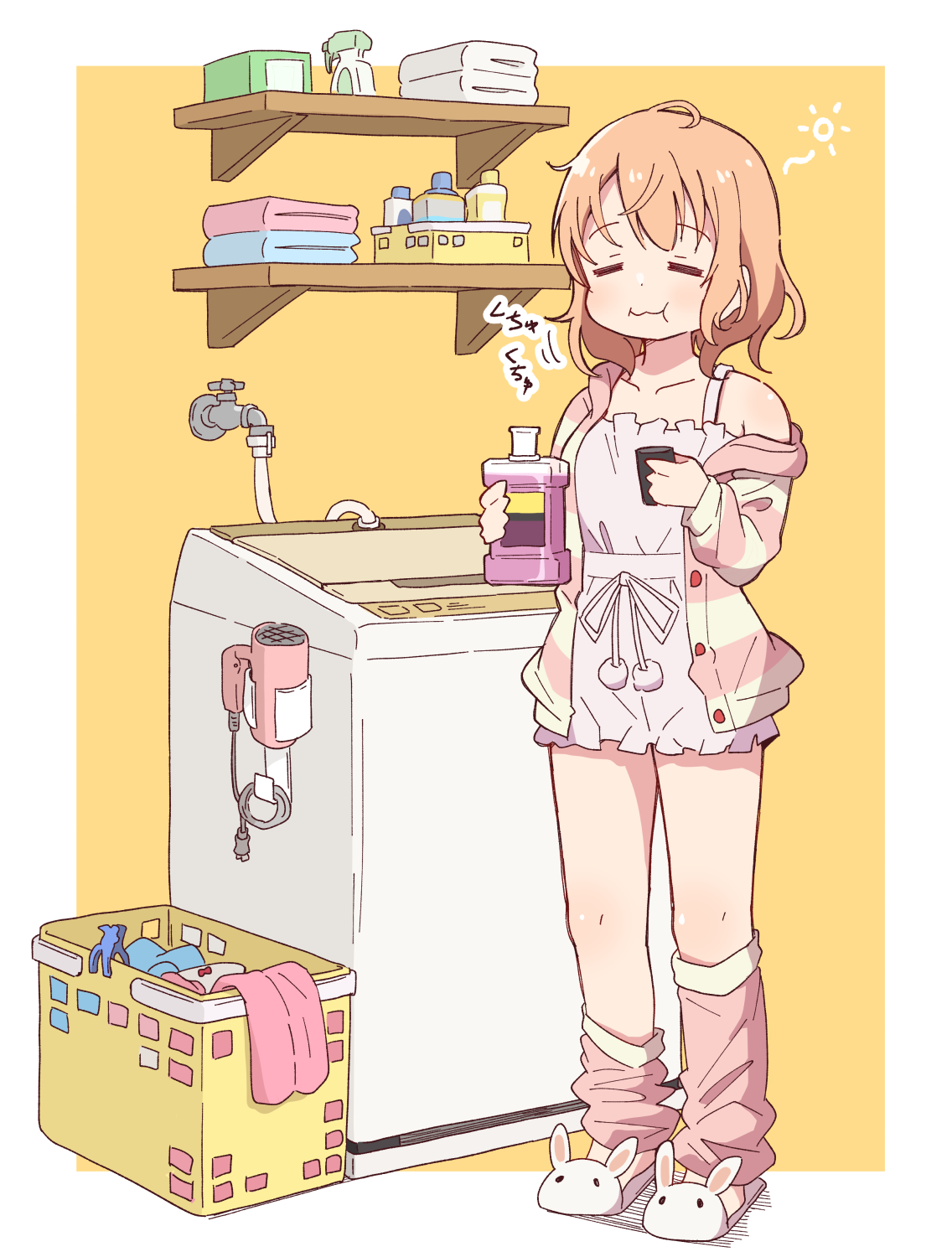1girl animal_slippers basket border bottle breasts bunny_slippers buttons closed_mouth clothes_pin collarbone commentary_request facing_viewer faucet full_body gochuumon_wa_usagi_desu_ka? hair_dryer highres holding holding_bottle hoto_cocoa jacket laundry_basket leg_warmers loungewear messy_hair mohei motion_lines mouthwash multicolored_jacket open_clothes open_jacket orange_hair pink_jacket pink_leg_warmers pink_shirt pink_shorts pom_pom_(clothes) shelf shirt short_hair shorts simple_background single_bare_shoulder slippers small_breasts solo spray_bottle standing striped_clothes striped_jacket sun_symbol top-load_washing_machine towel two-tone_jacket washing_machine wavy_mouth white_border white_slippers yellow_background yellow_jacket