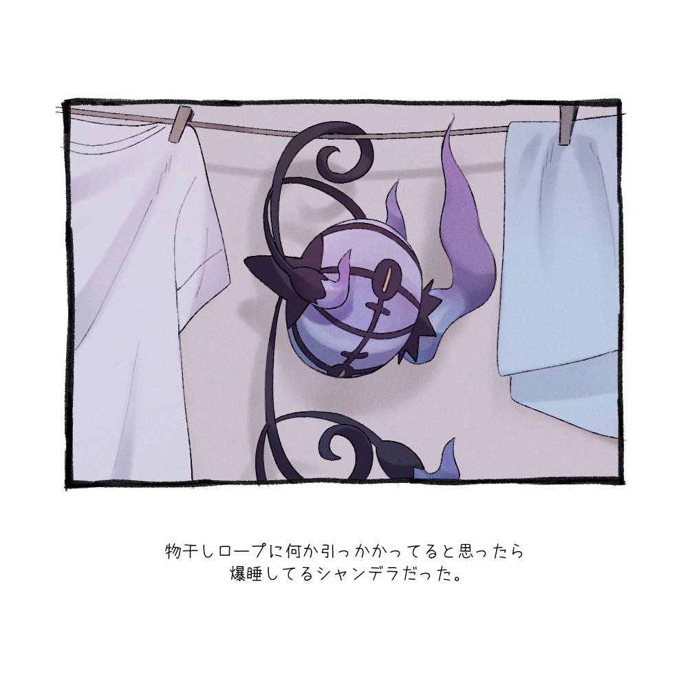 animal_focus black_border blue_fire border chandelure closed_eyes clothes_pin clothesline drop_shadow drying drying_clothes fire gen_5_pokemon hanging_on_clothesline indoors laundry nintendo no_humans pokemon pokemon_(creature) purple_fire shirt simple_background sleeping solo towel translation_request white_background white_shirt yukichi_(tsuknak1)