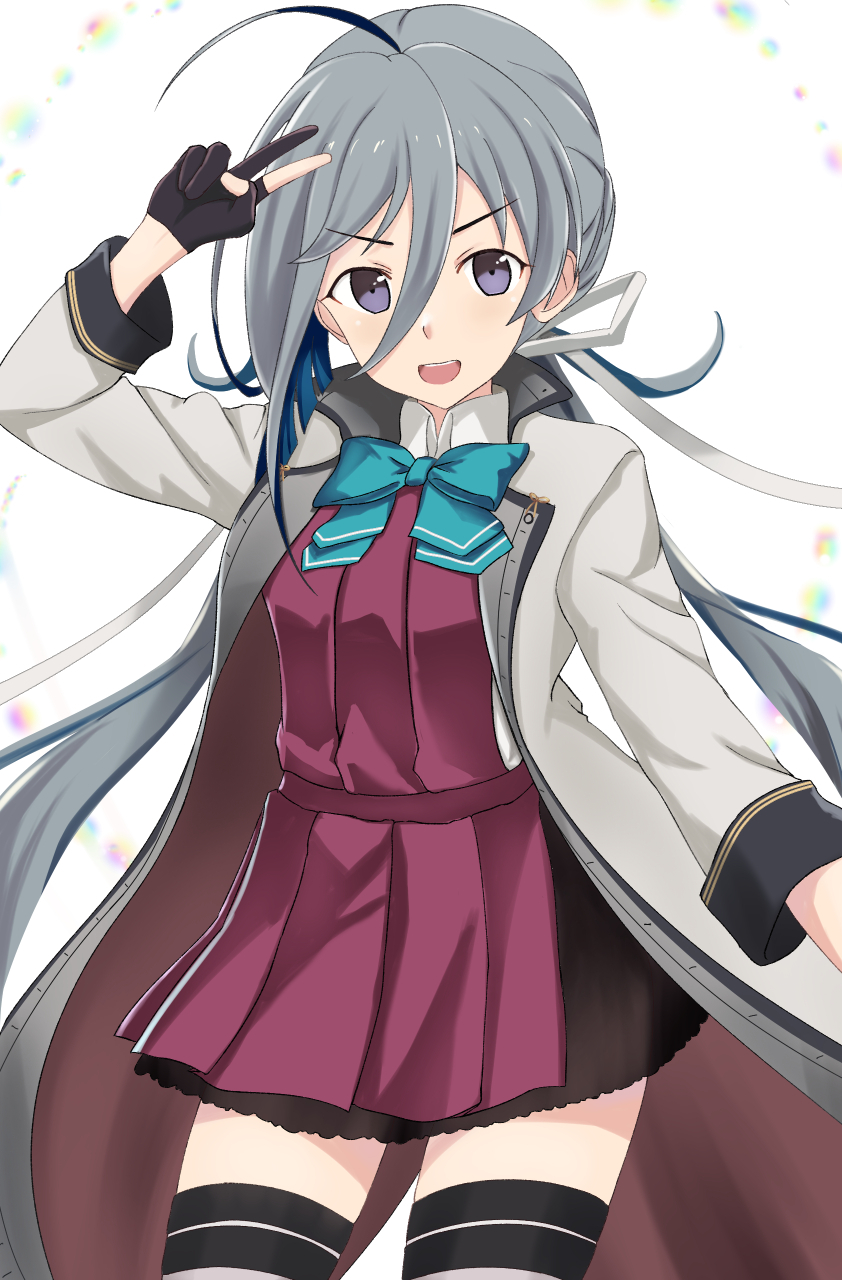1girl :d ahoge blue_bow blue_bowtie bow bowtie cowboy_shot dress grey_eyes grey_hair grey_jacket hair_between_eyes highres jacket kantai_collection kiyoshimo_(kancolle) kiyoshimo_kai_ni_(kancolle) kotou_yogen long_hair long_sleeves looking_at_viewer low_twintails open_mouth purple_dress purple_eyes ribbon school_uniform smile solo thighhighs twintails v very_long_hair white_ribbon