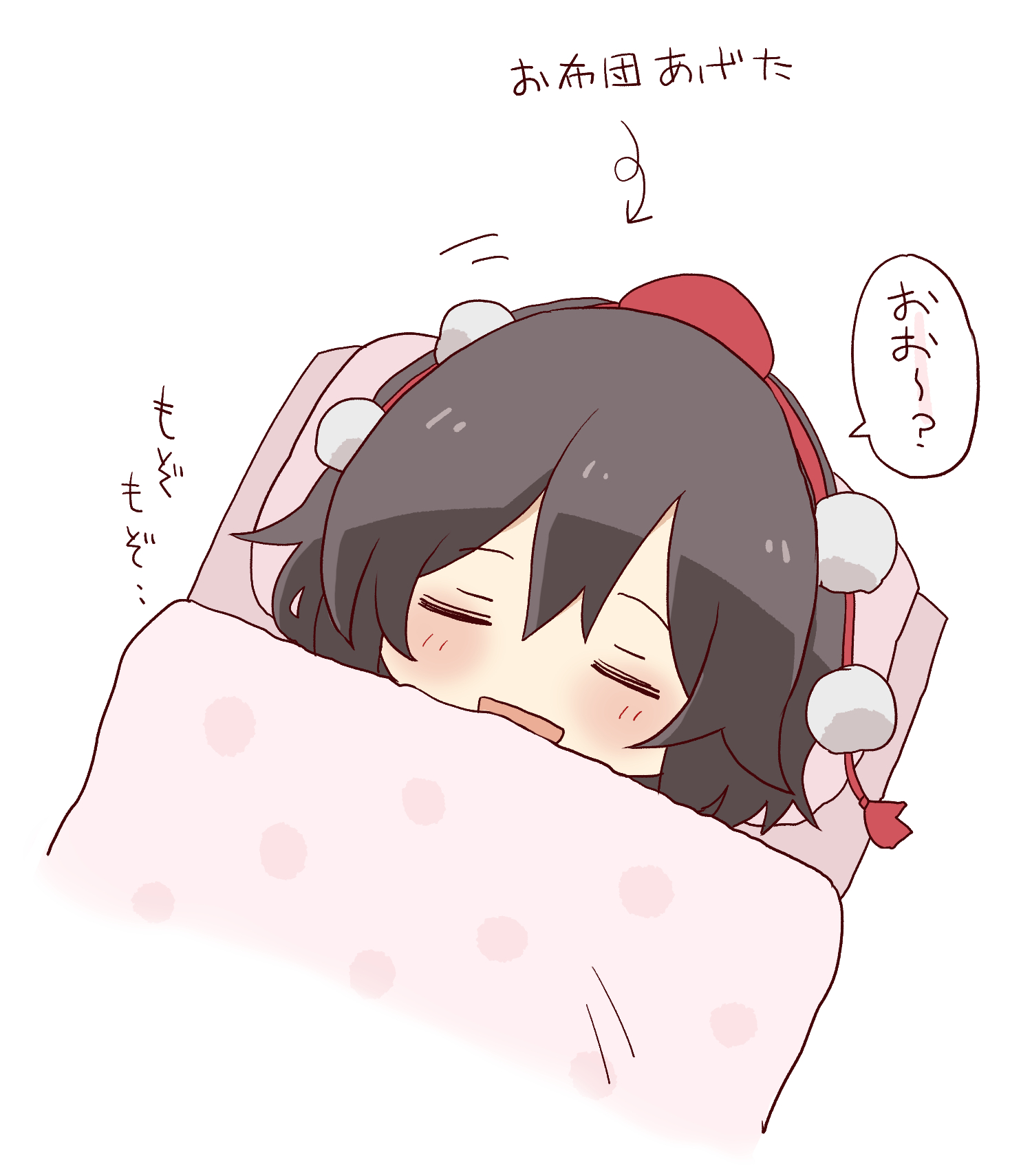 1girl :d arrow_(symbol) black_hair blush chibi closed_eyes facing_viewer futon hair_between_eyes hat highres mini_hat open_mouth pillow red_hat shameimaru_aya simple_background smile solo tokin_hat totoharu_(kujirai_minato) touhou translation_request under_covers white_background