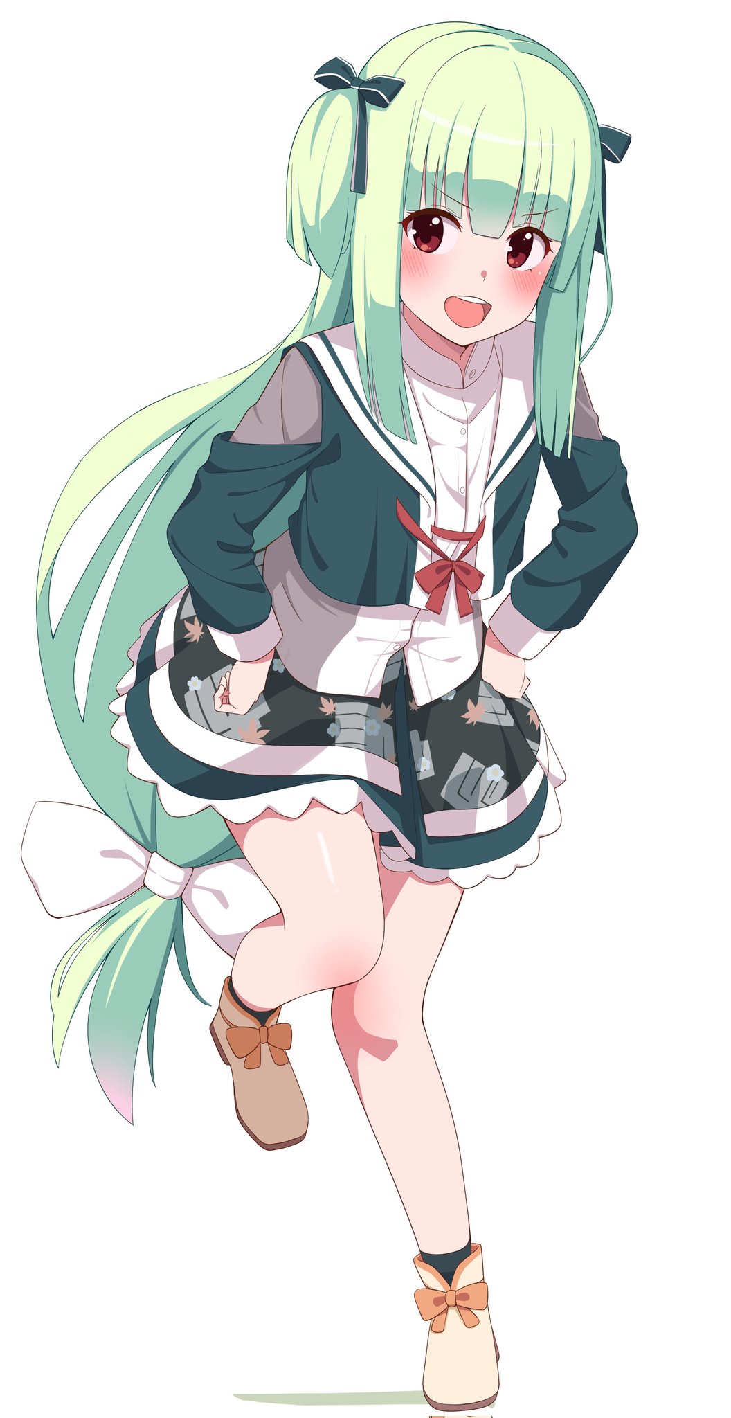 1girl :d blunt_bangs blunt_ends blush boots bow corrupted_twitter_file cropped_jacket dress_shirt eyes_visible_through_hair footwear_bow frilled_skirt frills full_body green_hair green_jacket green_ribbon green_skirt hair_ribbon hands_on_own_hips highres hime_cut jacket leaf_print long_hair long_sleeves looking_at_viewer low-tied_long_hair miniskirt murasame_(senren) official_alternate_costume official_alternate_hairstyle open_mouth orange_bow red_bow red_eyes ribbon school_uniform senren_banka shirt sidelocks simple_background skirt smile smug solo standing standing_on_one_leg straight_hair teeth two_side_up upper_teeth_only v-shaped_eyebrows very_long_hair white_background white_shirt yellow_boots zlmh7okwwbmghfo
