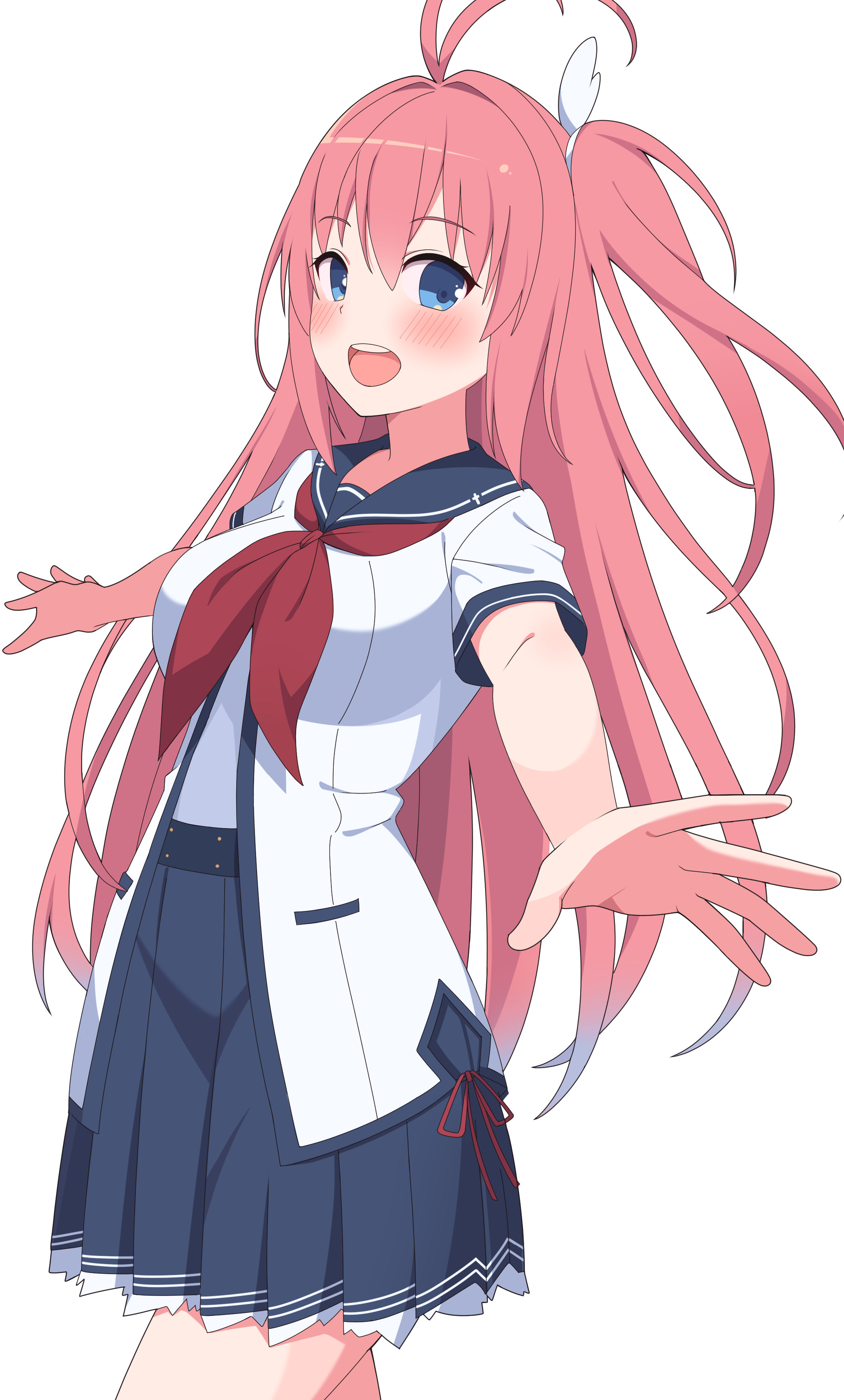 1girl :d absurdres antenna_hair ao_no_kanata_no_four_rhythm blue_eyes blue_sailor_collar blue_skirt blush breasts commentary_request cowboy_shot eyelashes frilled_skirt frills hair_between_eyes hair_ornament happy high-waist_skirt highres kurashina_asuka long_hair looking_at_viewer medium_breasts miniskirt neckerchief open_clothes open_hands open_mouth open_shirt outstretched_arms pink_hair pleated_skirt red_neckerchief sailor_collar school_uniform shirt short_sleeves simple_background skirt smile solo standing straight_hair teeth two_side_up upper_teeth_only very_long_hair white_background white_shirt wing_hair_ornament zlmh7okwwbmghfo