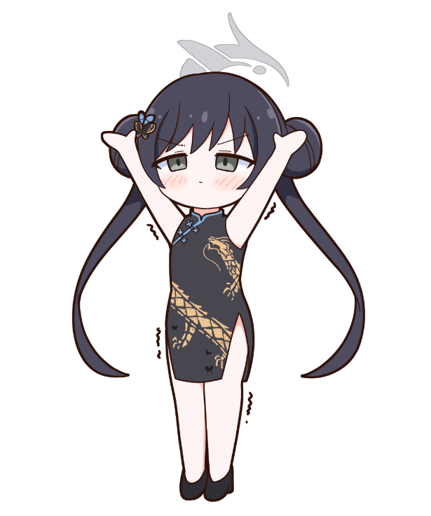 1girl achilles_(yosshyachillesd) arms_up black_dress black_footwear black_hair blue_archive blush butterfly_hair_ornament china_dress chinese_clothes commentary double_bun dragon_print dress full_body grey_eyes hair_bun hair_ornament halo kisaki_(blue_archive) looking_ahead serious side_slit sleeveless sleeveless_dress solo standing stretching trembling twintails v-shaped_eyebrows