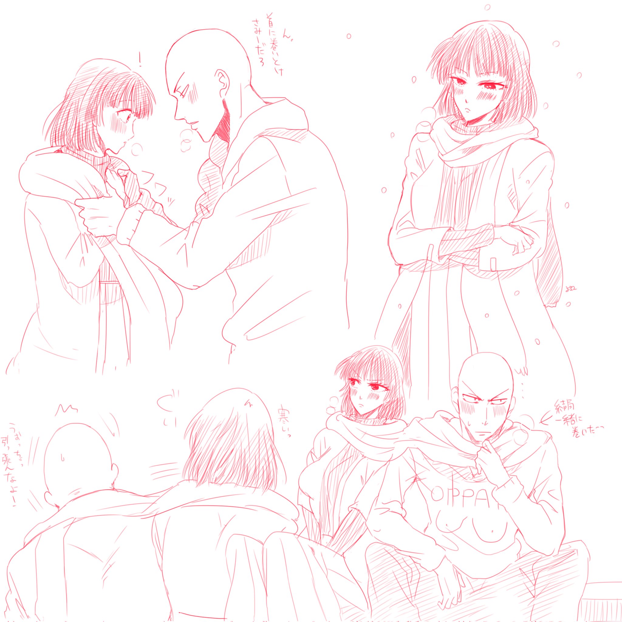 1boy 1girl blush couple dating doodle flustered fubuki_(one-punch_man) highres hood hoodie nervous nervous_sweating one-punch_man outdoors pants saitama_(one-punch_man) scarf short_hair shy sitting sweat winter winter_clothes