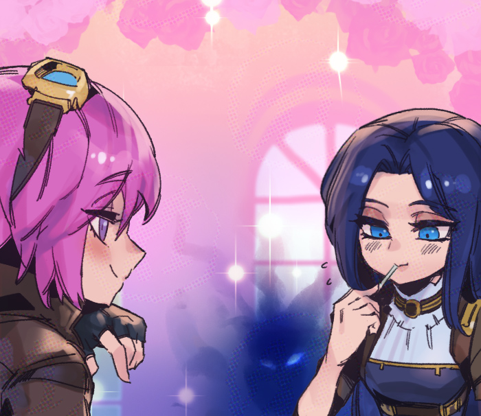 2girls black_gloves blue_eyes blue_hair brown_choker brown_jacket caitlyn_(league_of_legends) choker eating fingerless_gloves ghost gloves goggles goggles_on_head holding_utensil jacket league_of_legends long_hair multicolored_background multiple_girls parted_bangs phantom_cross pink_eyes pink_hair shirt short_hair smile sparkle utensil_in_mouth vi_(league_of_legends) white_shirt window