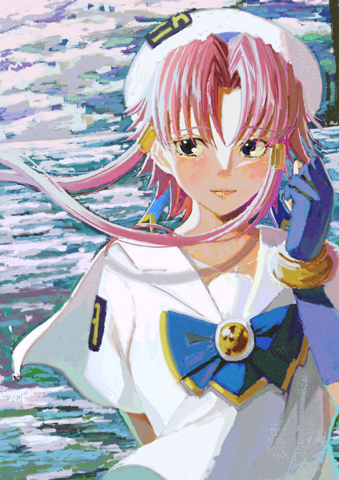 1girl alternate_eye_color aria_(manga) aria_company_uniform arm_behind_back beret blue_bow blue_bowtie blue_eyes blue_gloves blue_ribbon blush bow bowtie bracelet closed_mouth collarbone day eyelashes fingerless_gloves gloves gold_trim hair_ornament hair_tubes hand_up harikonoma hat hat_ribbon highres jewelry lips mizunashi_akari parted_bangs pink_hair ribbon sailor_collar shadow short_hair_with_long_locks short_sleeves sidelocks solo upper_body water white_hat
