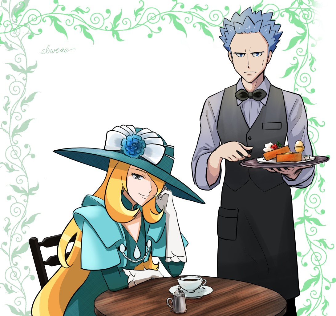 1boy 1girl alternate_color blonde_hair blue_hair bow bowtie breast_pocket chair cogita_(pokemon) cogita_(pokemon)_(cosplay) cosplay cup cynthia_(pokemon) cyrus_(pokemon) dress erushiza gloves hair_over_one_eye hat holding holding_tray looking_at_viewer nintendo on_chair pocket pokemon pokemon_diamond/pearl/platinum pokemon_legends:_arceus signature sitting smile table tray waiter white_gloves