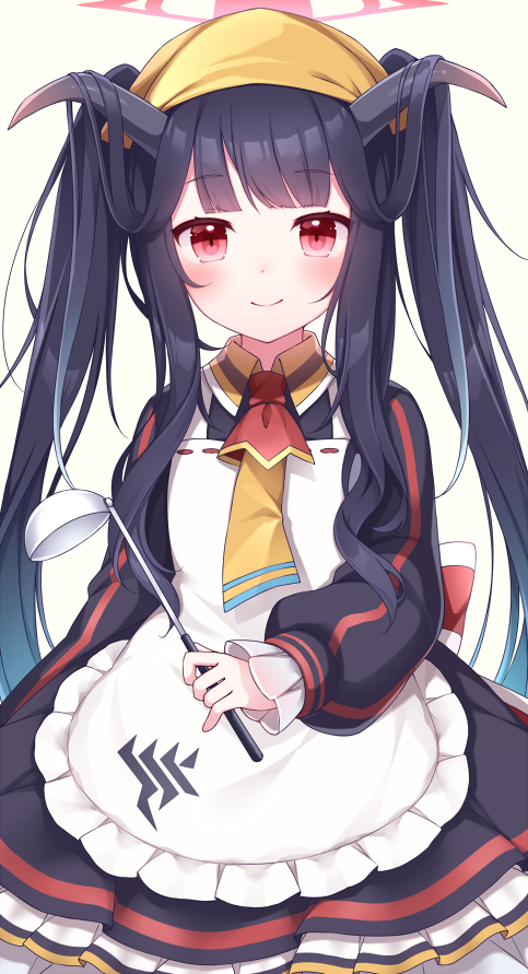 1girl apron black_dress black_hair black_horns blue_archive blush closed_mouth demon_horns dress frilled_apron frilled_dress frills fuuka_(blue_archive) headscarf holding holding_ladle horns ladle long_hair long_sleeves looking_at_viewer red_eyes sanotsuki simple_background smile solo white_apron white_background yellow_headscarf yellow_headwear