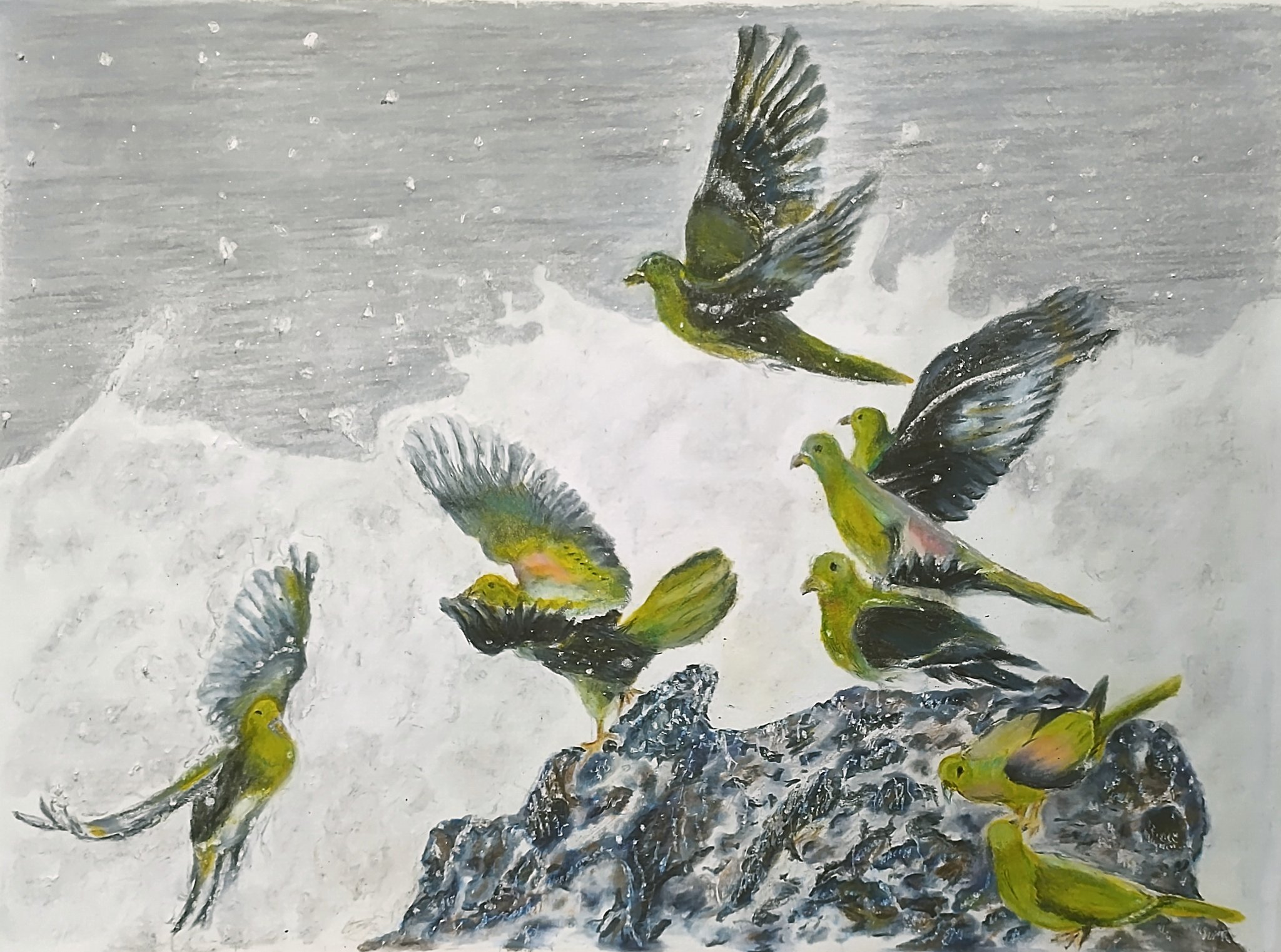 above_clouds animal animal_focus bird cloud colored_pencil_(medium) flying highres mountain nakanaori31 no_humans original realistic signature snowing storm traditional_media white-bellied_green_pigeon