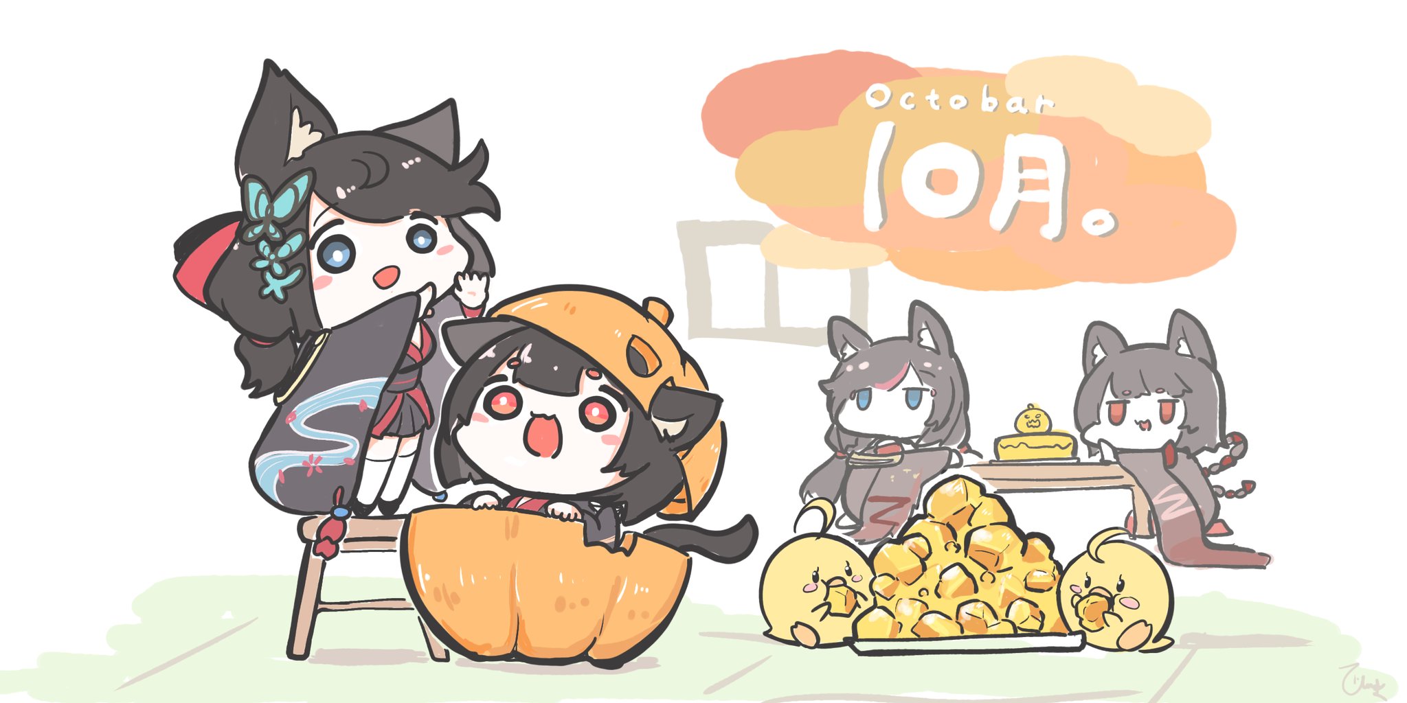 4girls animal_ears azur_lane black_hair blue_butterfly blue_eyes bug butterfly butterfly_hair_ornament cat_ears cat_girl cat_tail chair chibi fusou_(azur_lane) fusou_(meta)_(azur_lane) hair_ornament highres himajin_(fd_jin) indoors insect long_sleeves manjuu_(azur_lane) multiple_girls on_chair open_mouth pumpkin red_eyes standing standing_on_chair tail thighhighs white_thighhighs wide_sleeves yamashiro_(azur_lane) yamashiro_(meta)_(azur_lane)