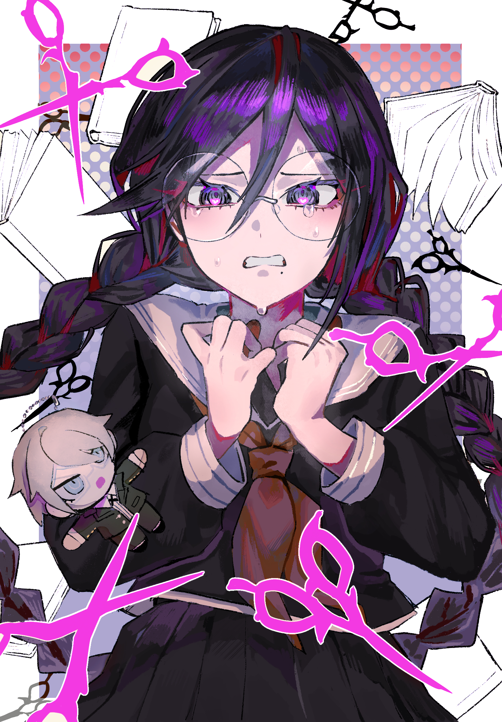 1girl black_hair black_shirt black_skirt book braid brown_neckerchief character_doll charm_(object) clenched_teeth danganronpa:_trigger_happy_havoc danganronpa_(series) doll fukawa_toko glasses grey_sailor_collar hair_between_eyes highres long_hair long_sleeves mole mole_under_mouth neckerchief open_book pale_skin pleated_skirt purple_hair red_hair round_eyewear sailor_collar saki_(sa_saki414) scissors shirt skirt solo teeth togami_byakuya twin_braids twintails white_background