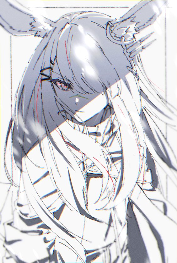 animal_ear_fluff animal_ears arknights closed_mouth coat expressionless frostnova_(arknights) hair_over_one_eye konota_ko long_hair looking_at_viewer rabbit_ears rabbit_girl ring_hair_ornament scar scar_on_face scar_on_nose scarf simple_background solo spot_color upper_body white_background