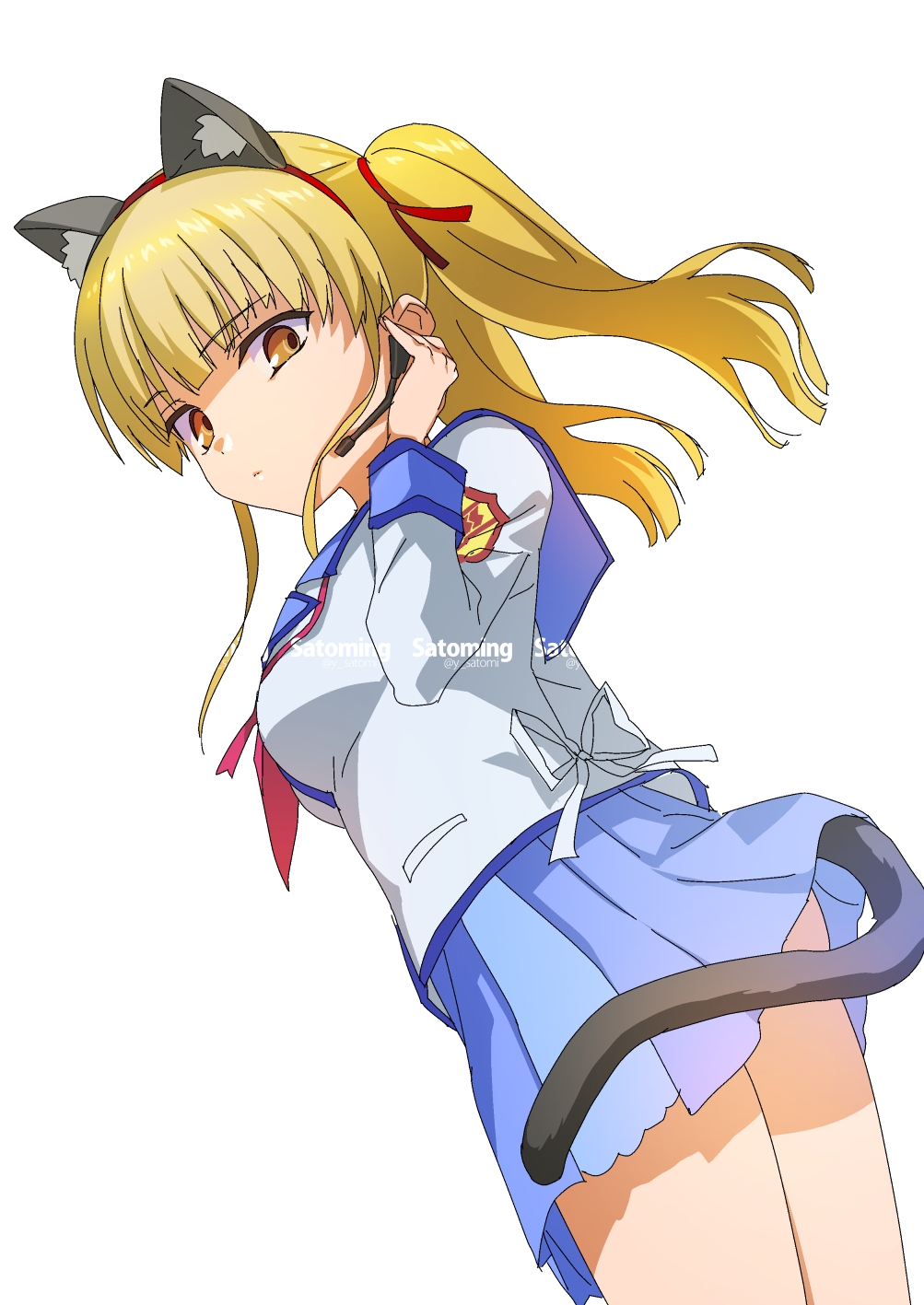 1girl angel_beats! animal_ear_fluff animal_ears artist_name blonde_hair blue_sailor_collar blue_skirt blunt_bangs blunt_ends breasts cat_ears cat_tail closed_mouth commentary_request cowboy_shot dutch_angle earpiece expressionless fake_animal_ears fake_tail hair_ribbon hand_up highres long_sleeves looking_at_viewer medium_breasts miniskirt neckerchief orange_eyes pink_neckerchief pleated_skirt red_ribbon ribbon sailor_collar satomi_yoshitaka shinda_sekai_sensen_uniform shirt sidelocks simple_background skirt solo standing tail twintails white_background white_shirt yusa_(angel_beats!)