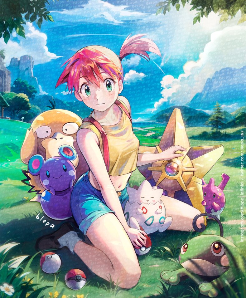 1girl asymmetrical_hair azurill blopa1987 blush corsola cowboy_shot denim denim_shorts eyelashes female_focus gen_1_pokemon gen_2_pokemon gen_3_pokemon green_eyes gym_leader hair_between_eyes hair_tie looking_at_viewer misty_(pokemon) navel nintendo orange_hair pokemon pokemon_(anime) pokemon_(classic_anime) politoed ponytail psyduck shirt short_hair short_shorts shorts side_ponytail smile solo staryu suspenders tank_top togepi yellow_shirt yellow_tank_top
