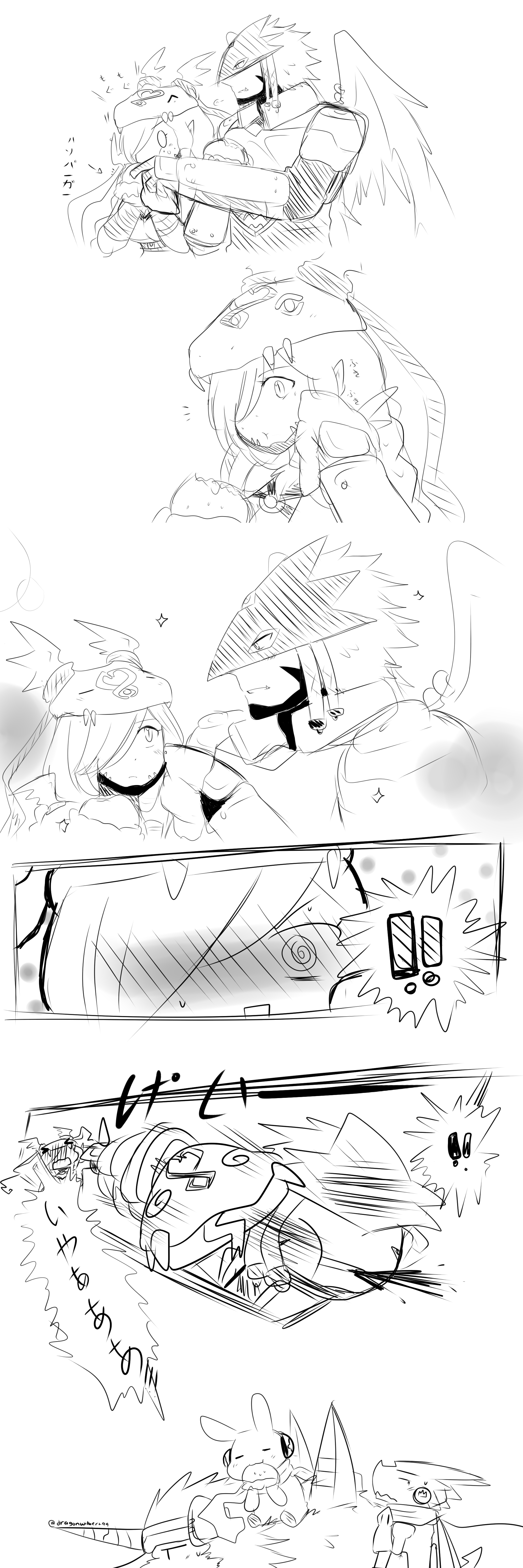 absurdres armor beelzebumon_(digimon_xros_wars) braid breasts cutemon digimon digimon_(creature) dorulumon headphones helmet highres japanese_text long_hair medium_breasts mervamon scarf shoutmon translation_request
