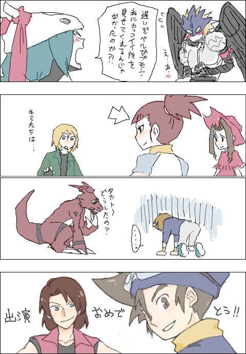 aonuma_kiriha beelzebumon_(digimon_xros_wars) blonde_hair brown_hair daimon_masaru_(digimon_savers) digimon goggles goggles_on_head guilmon hat japanese_text makino_ruki mask matsuda_takato mervamon open_mouth tachikawa_mimi translation_request yagami_taichi