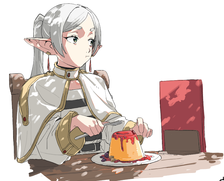 1girl capelet chair closed_mouth dress earrings eating elf food fork frieren green_eyes grey_hair holding jewelry long_hair long_sleeves looking_to_the_side parted_bangs plate pointy_ears pudding rkgk_ojisan shade simple_background solo sousou_no_frieren teardrop_earrings twintails white_background white_capelet white_dress white_hair wizard