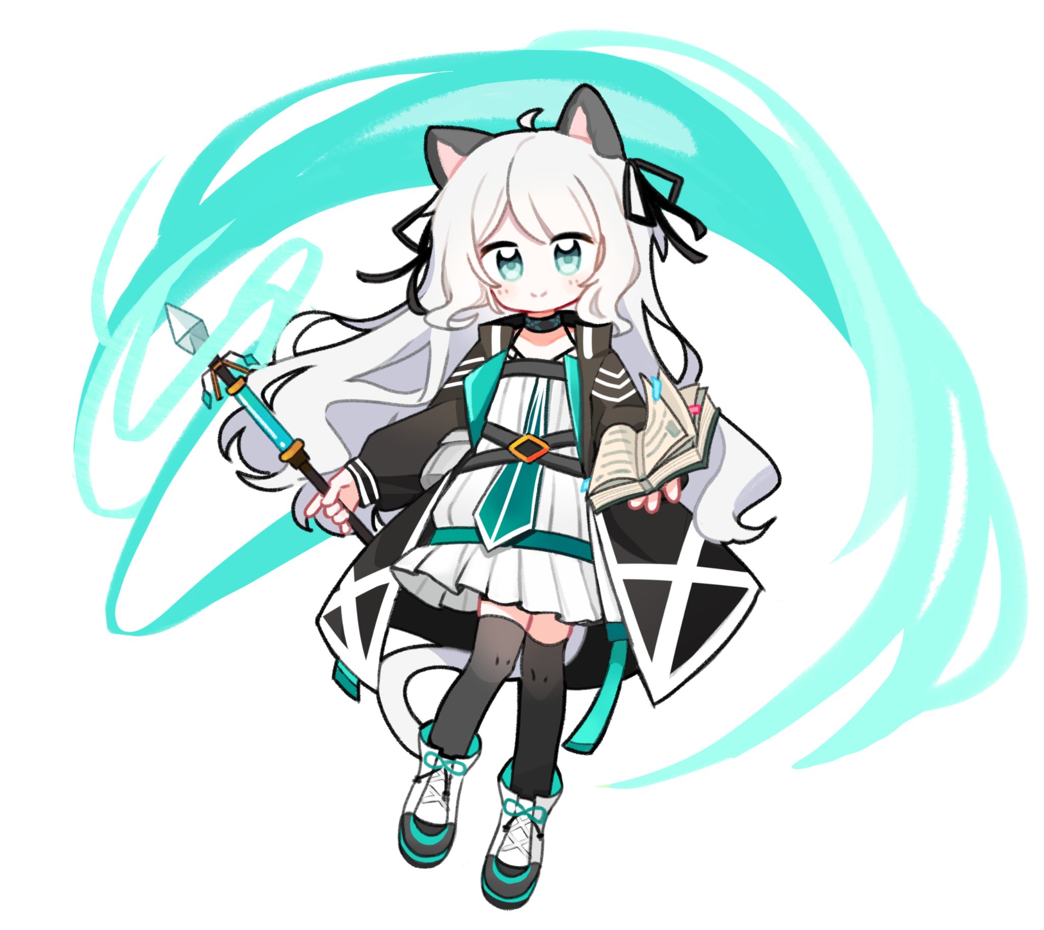 1girl akaruku animal_ears arknights black_coat black_ribbon black_thighhighs blush book cat_ears cat_girl cat_tail chinese_commentary closed_mouth coat commentary_request cowlick dress green_eyes hair_ribbon highres holding holding_book holding_wand long_hair long_sleeves looking_at_viewer magic mint_(arknights) open_book open_clothes open_coat ribbon shoes sidelocks simple_background smile sneakers solo tail thighhighs wand white_background white_dress white_hair white_shoes