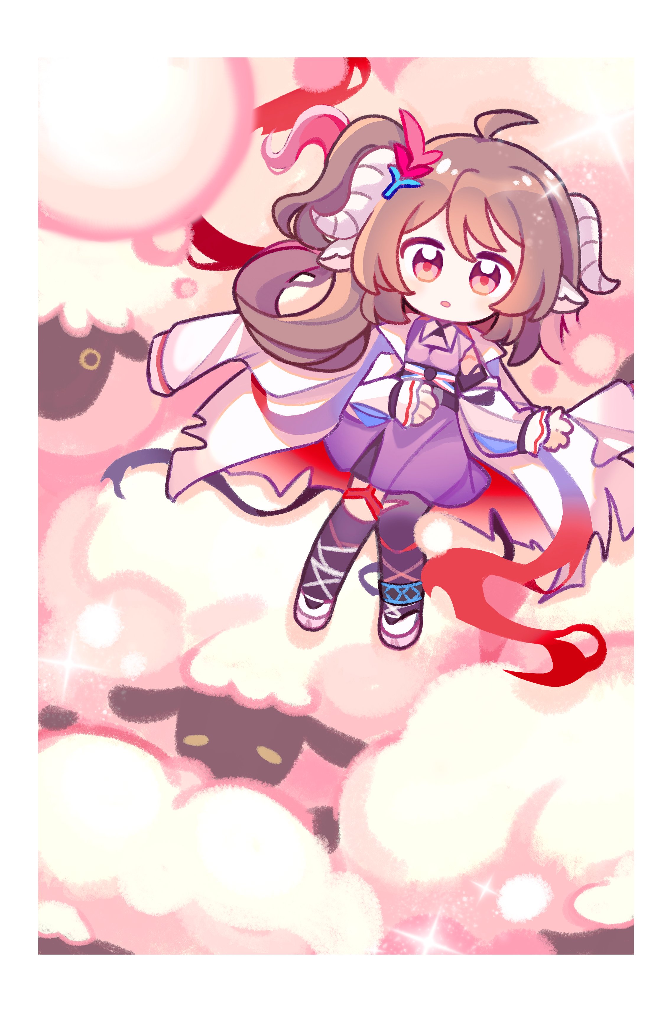 1girl :o absurdres akaruku animal animal_ears arknights asymmetrical_legwear border brown_hair chibi coat coat_on_shoulders commentary cow dress eyjafjalla_(arknights) eyjafjalla_the_hvit_aska_(arknights) full_body highres horns long_hair looking_at_viewer mismatched_legwear on_animal one_side_up open_mouth pink_eyes purple_dress red_ribbon ribbon sheep sheep_ears sheep_girl sheep_horns solo torn_clothes torn_coat white_coat