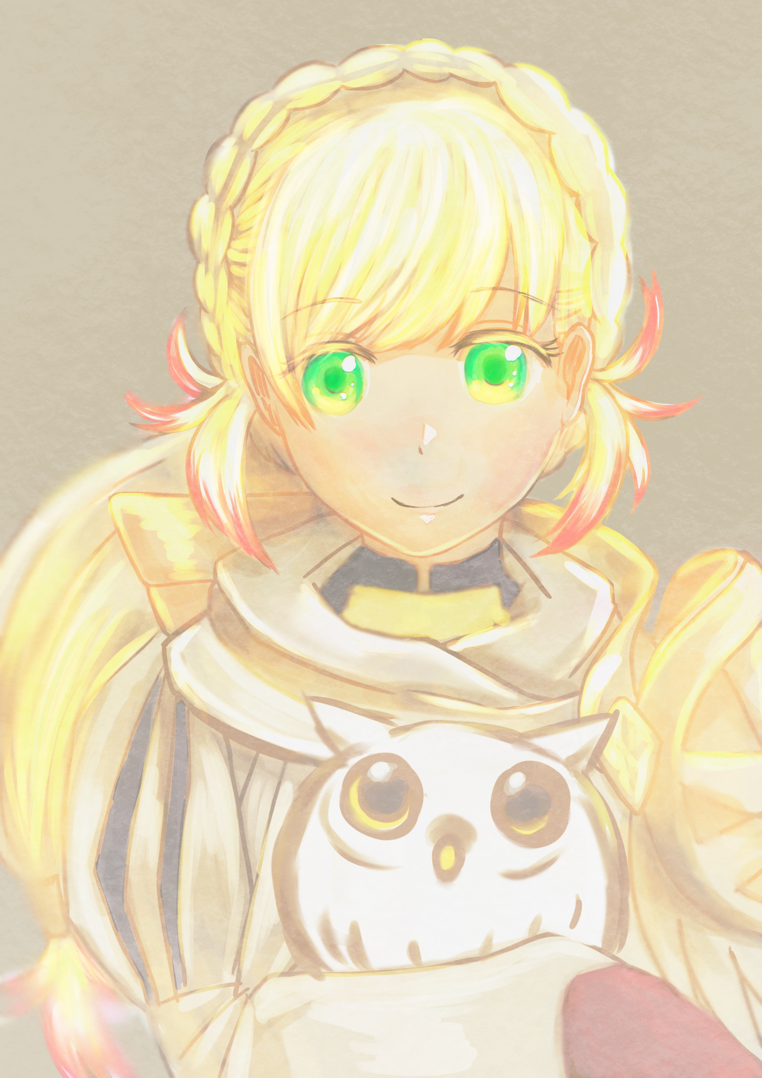 2girls absurdres bird blonde_hair braid facing_viewer feh_(fire_emblem_heroes) fire_emblem french_braid green_eyes highres looking_at_viewer multiple_girls nintendo owl sharena_(fire_emblem) swept_bangs tochiryo