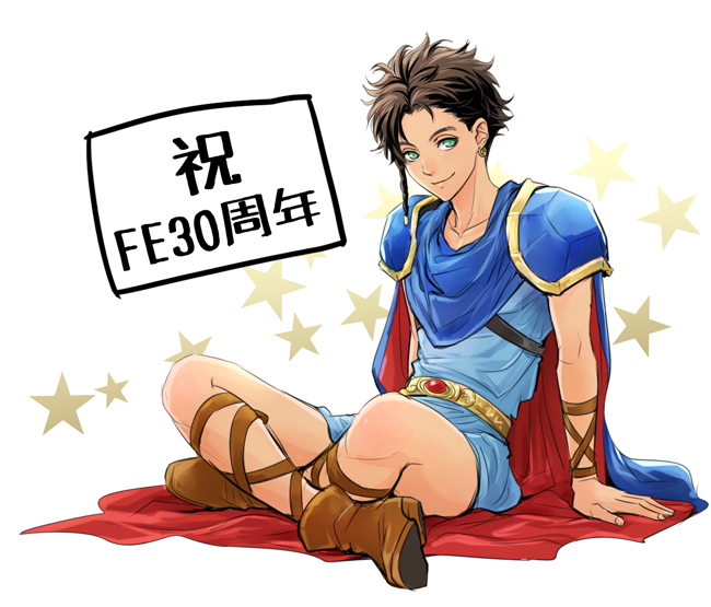 1boy boots brown_hair cape claude_von_riegan closed_mouth cosplay dark-skinned_male dark_skin earrings fire_emblem fire_emblem:_three_houses green_eyes jewelry leather leather_boots male_focus marth_(fire_emblem) marth_(fire_emblem)_(cosplay) nintendo saku_(soreca49) sitting smile solo