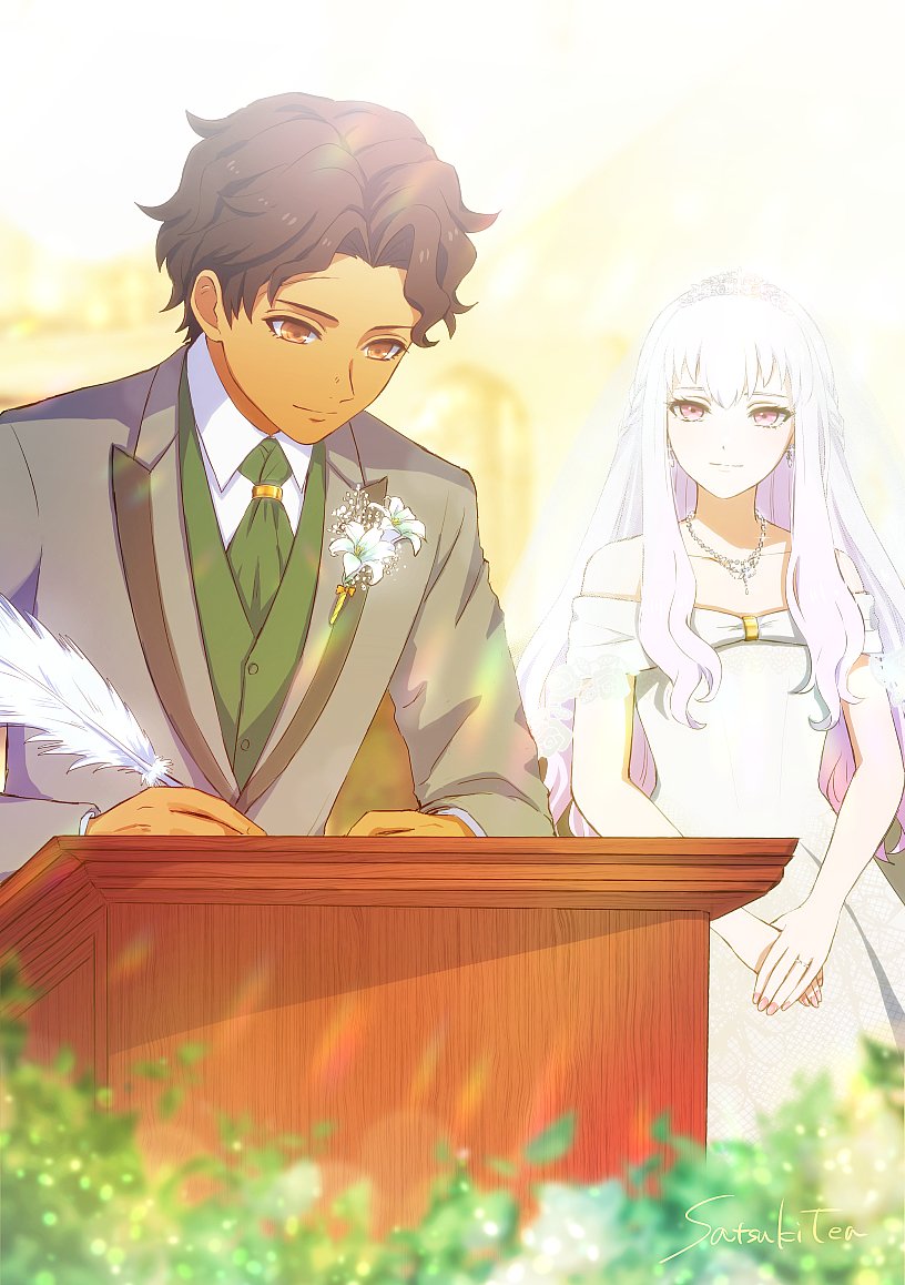 1boy 1girl bride brown_hair couple cyril_(fire_emblem) cyril_(timeskip)_(fire_emblem) dark-skinned_male dark_skin dfhnokenbutu dress facing_viewer fire_emblem fire_emblem:_three_houses groom hetero holding holding_quill jewelry looking_at_another lysithea_von_ordelia lysithea_von_ordelia_(timeskip) nintendo quill red_eyes ring upper_body wedding wedding_dress wedding_ring
