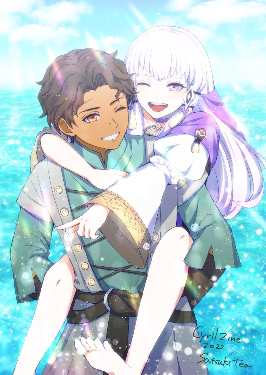 1boy 1girl barefoot brown_hair couple cyril_(fire_emblem) cyril_(timeskip)_(fire_emblem) dark-skinned_male dark_skin dfhnokenbutu fire_emblem fire_emblem:_three_houses hetero highres looking_at_another lysithea_von_ordelia lysithea_von_ordelia_(timeskip) nintendo purple_eyes red_eyes smile upper_body white_hair