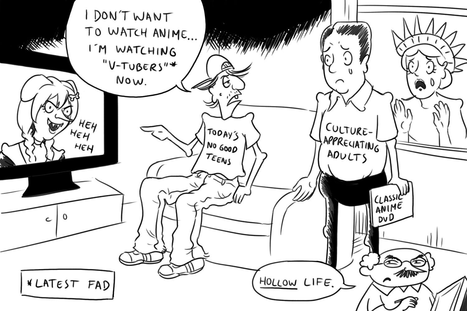 2girls 3boys against_glass archived_source backwards_hat bald baseball_cap black_hair commentary couch crying drawfag english_commentary english_text facial_hair fourth_wall greyscale hands_up hat hololive indoors inugami_korone inugami_korone_(1st_costume) kelly_(style) looking_at_another looking_at_viewer monochrome multiple_boys multiple_girls mustache parody pointing politics pun sharp_teeth sideburns sitting stan_kelly statue_of_liberty style_parody tearing_up teeth television the_onion third-party_source v-shaped_eyebrows virtual_youtuber window