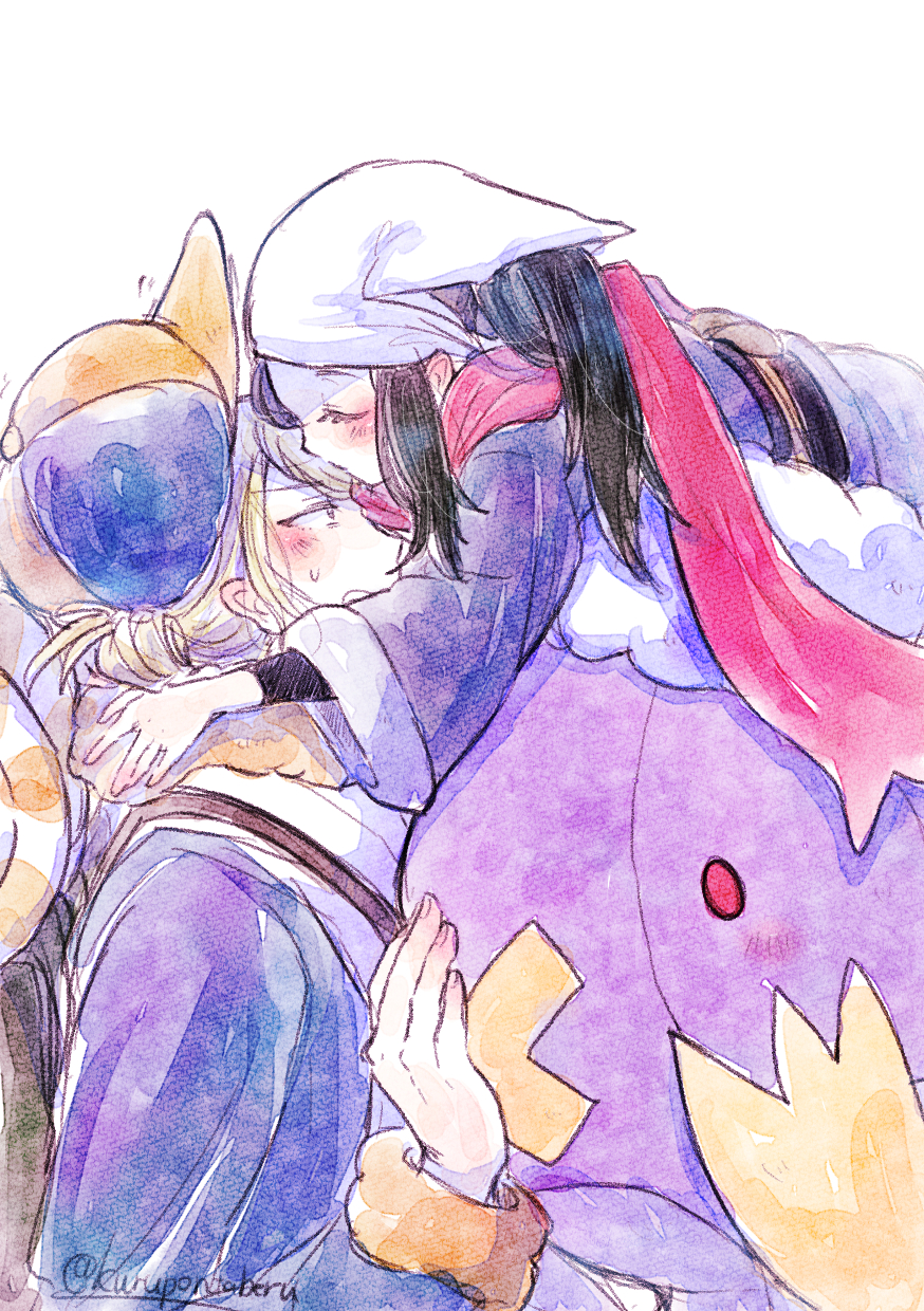 1boy 1girl akari_(pokemon) blonde_hair blue_hair blush closed_eyes commentary_request drifblim gen_4_pokemon hat headscarf hetero highres kiss kissing_forehead kurupontaberu long_hair nintendo pokemon pokemon_(creature) pokemon_legends:_arceus red_scarf scarf short_hair simple_background unworn_hat unworn_headwear upper_body volo_(pokemon) white_background white_headscarf
