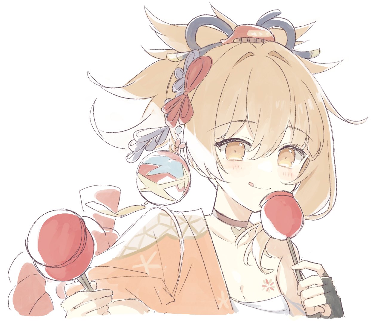 1girl :q black_gloves candy_apple chest_sarashi choker fingerless_gloves food genshin_impact gloves hadanugi_dousa hair_ornament holding holding_candy_apple holding_food japanese_clothes kimono light_brown_hair looking_at_viewer open_clothes open_kimono orange_eyes orange_kimono red_choker rope sarashi shimenawa shirase_(shirose) simple_background single_glove solo tattoo tongue tongue_out upper_body white_background yoimiya_(genshin_impact)