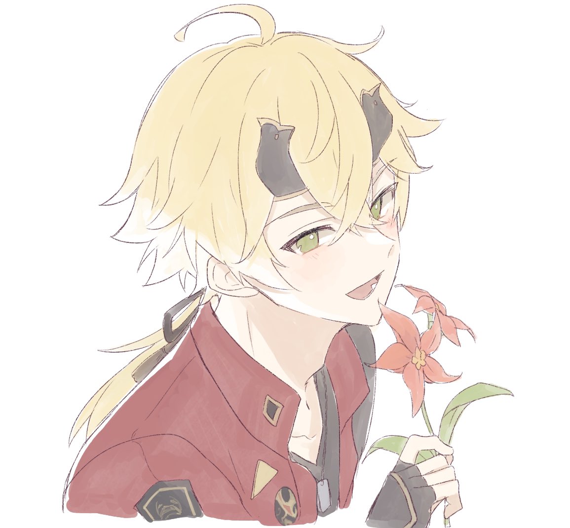 1boy black_gloves black_headband black_ribbon blonde_hair crossed_bangs dog_tags fake_horns fingerless_gloves flower genshin_impact gloves green_eyes hair_between_eyes hair_ribbon headband holding holding_flower horned_headwear horns long_hair looking_at_viewer male_focus open_mouth ponytail red_flower ribbon shirase_(shirose) simple_background solo thoma_(genshin_impact) upper_body white_background