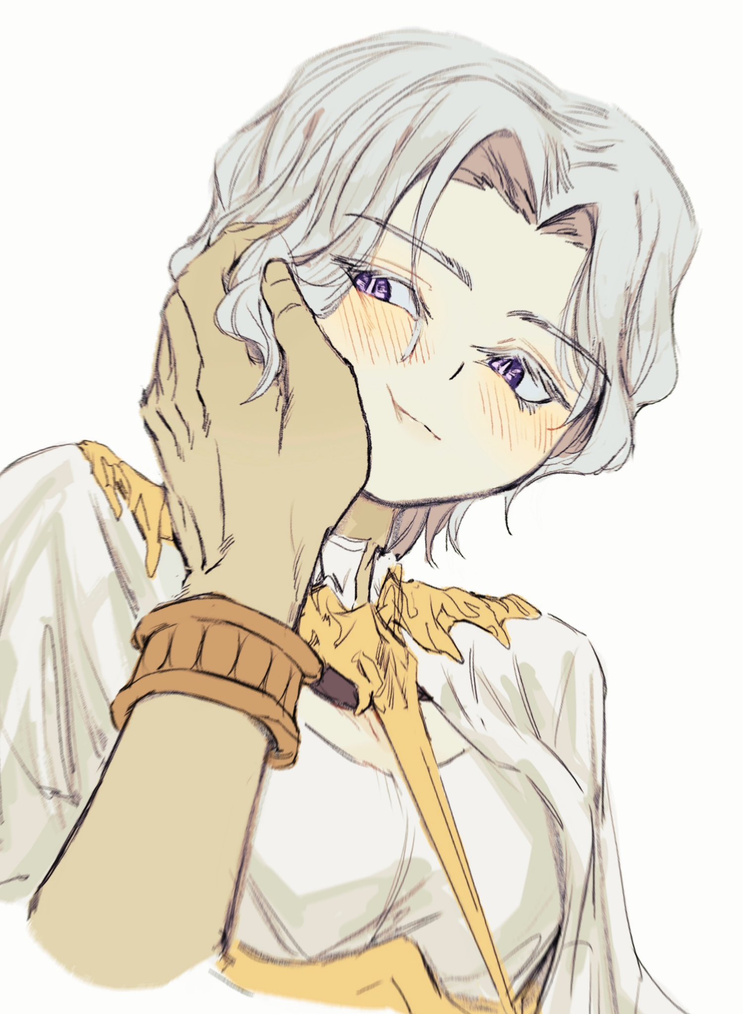 2boys blush brothers closed_mouth dark_souls_(series) dark_souls_i dark_souls_iii dark_sun_gwyndolin gold_necklace grey_hair hand_on_another's_cheek hand_on_another's_face highres jewelry multiple_boys nameless_king necklace parted_bangs purple_eyes short_hair siblings simple_background smile solo_focus trap upper_body white_background zunkome