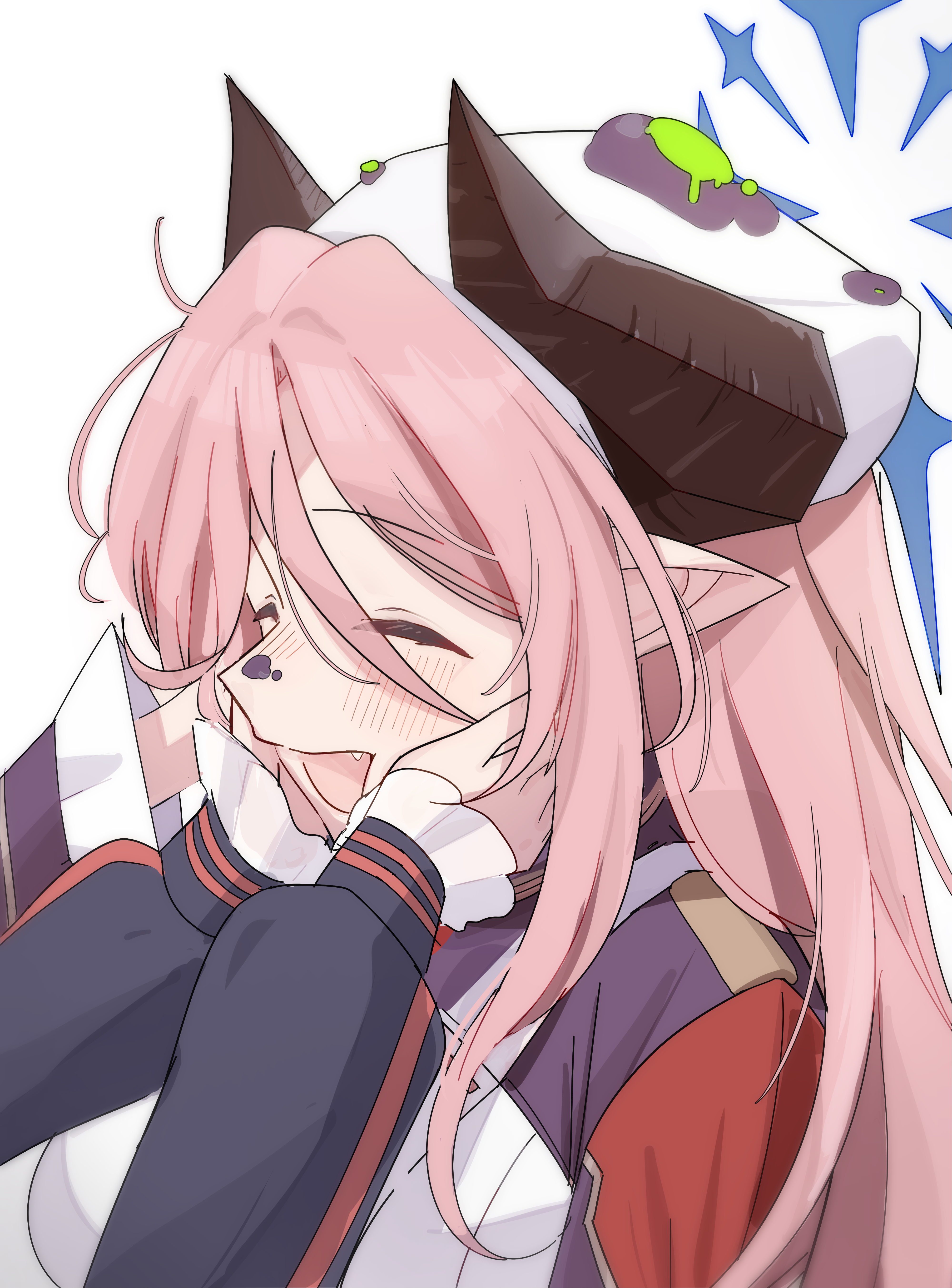 2girls absurdres blue_archive blue_halo blush brown_horns closed_eyes fang fuuka_(blue_archive) halo headscarf highres horns juri_(blue_archive) long_hair multiple_girls open_mouth patanda pink_hair pointy_ears simple_background white_background white_headscarf white_headwear