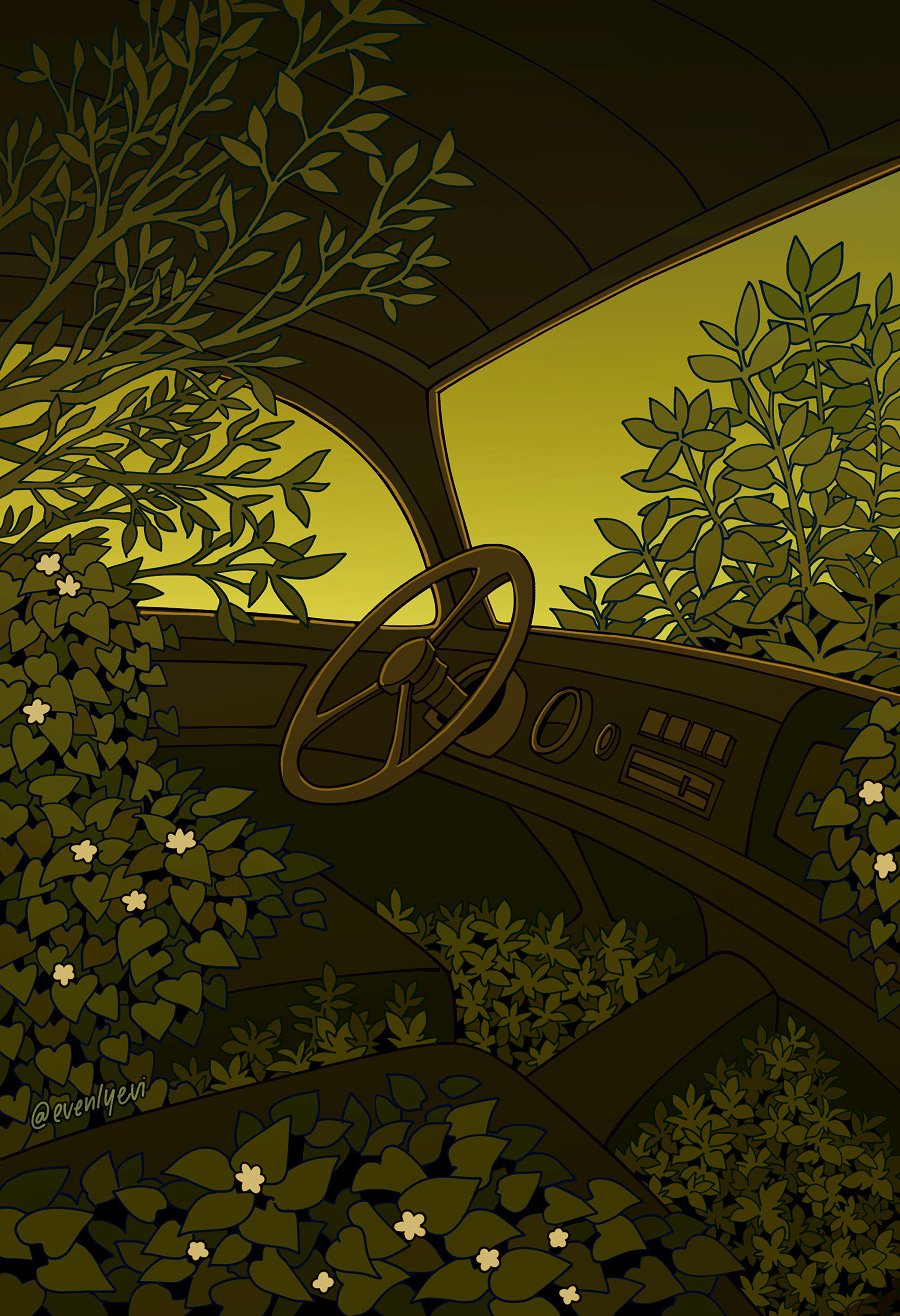 car car_interior commentary english_commentary evenlyevi flower green_theme highres leaf motor_vehicle nature no_humans original plant plant_focus signature sky still_life twitter_username white_flower yellow_sky