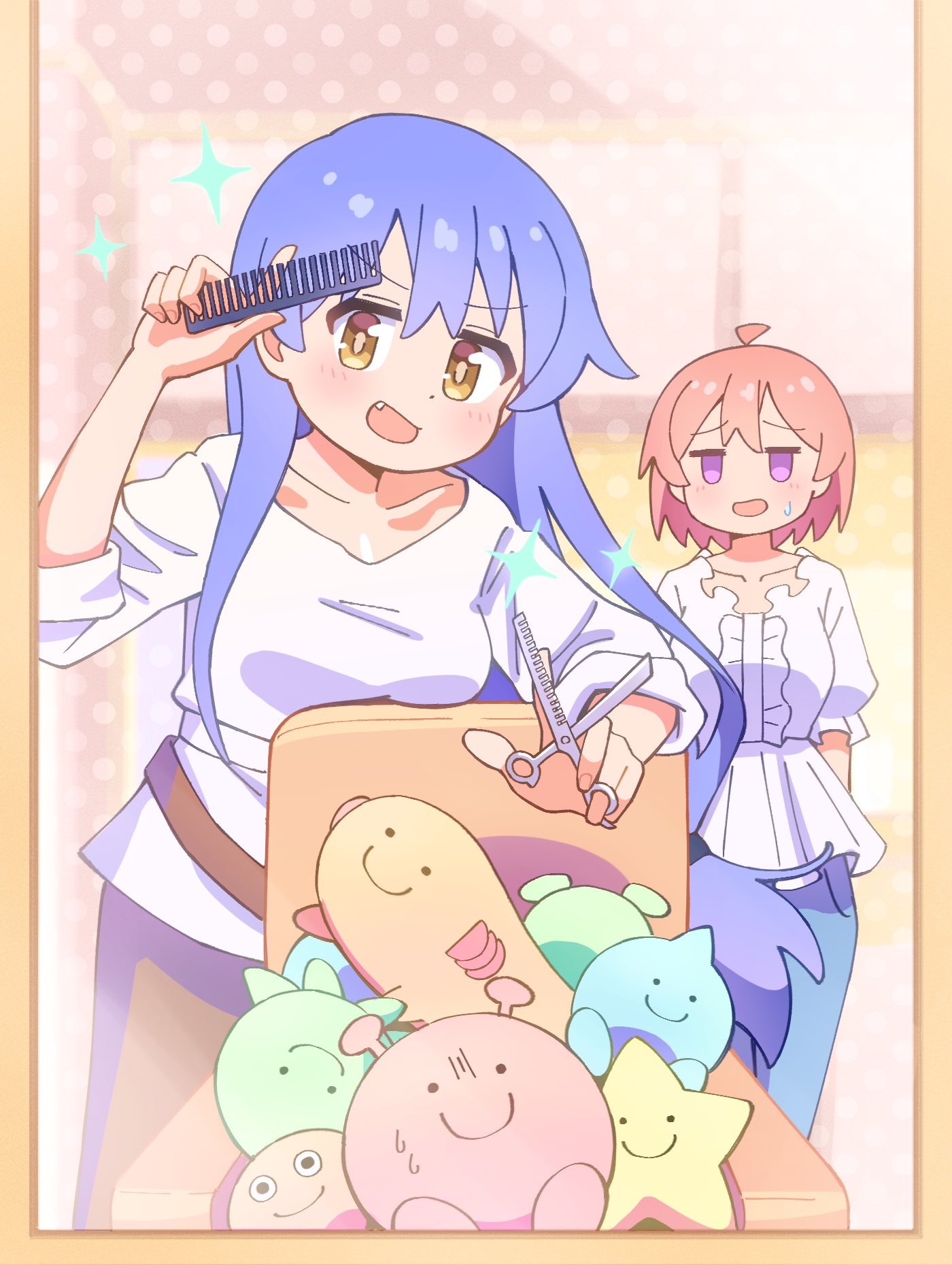 2girls :d :o ahoge blue_hair breasts c: collarbone comb commentary dot_nose fang hair_between_eyes highres hisaki_hiyori holding holding_comb holding_scissors jitome long_hair long_sleeves low-tied_long_hair medium_breasts mirror multiple_girls nanami_raika nuurise2023 onii-chan_wa_oshimai! open_mouth pink_hair purple_eyes reflection scissors shirt short_hair sleeves_rolled_up smile sparkle stuffed_toy sweatdrop very_long_hair white_shirt yellow_eyes
