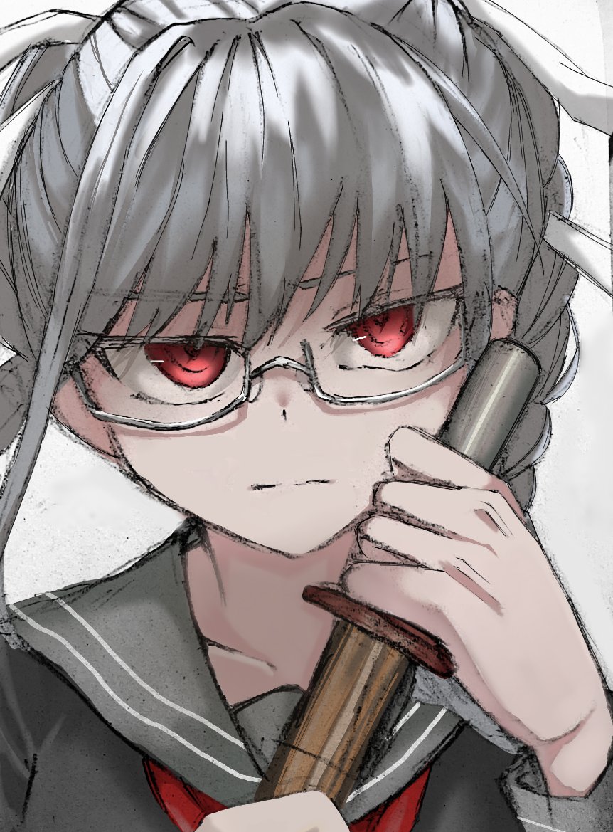 1girl black_shirt braid closed_mouth danganronpa_(series) danganronpa_2:_goodbye_despair expressionless glasses grey_background grey_hair grey_sailor_collar hair_ribbon hands_up holding holding_weapon koma_(uuur66) long_hair pekoyama_peko ribbon sailor_collar semi-rimless_eyewear shirt simple_background solo twin_braids twintails weapon