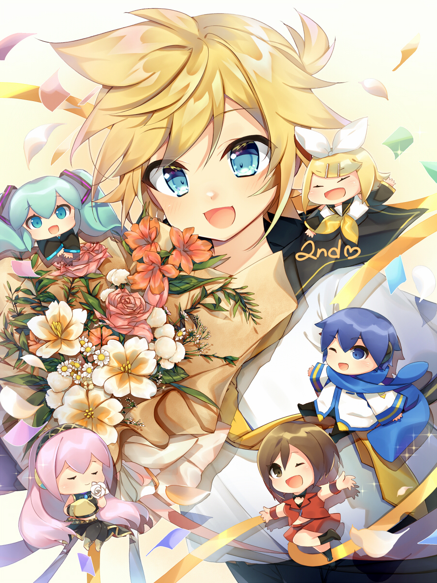 blonde_hair blue_eyes bouquet flower hatsune_miku highres holding holding_bouquet kagamine_len kagamine_rin kaito_(vocaloid) leeannpippisum megurine_luka meiko_(vocaloid) necktie open_mouth orange_flower ponytail red_flower sailor_collar shirt short_ponytail vocaloid white_flower white_shirt