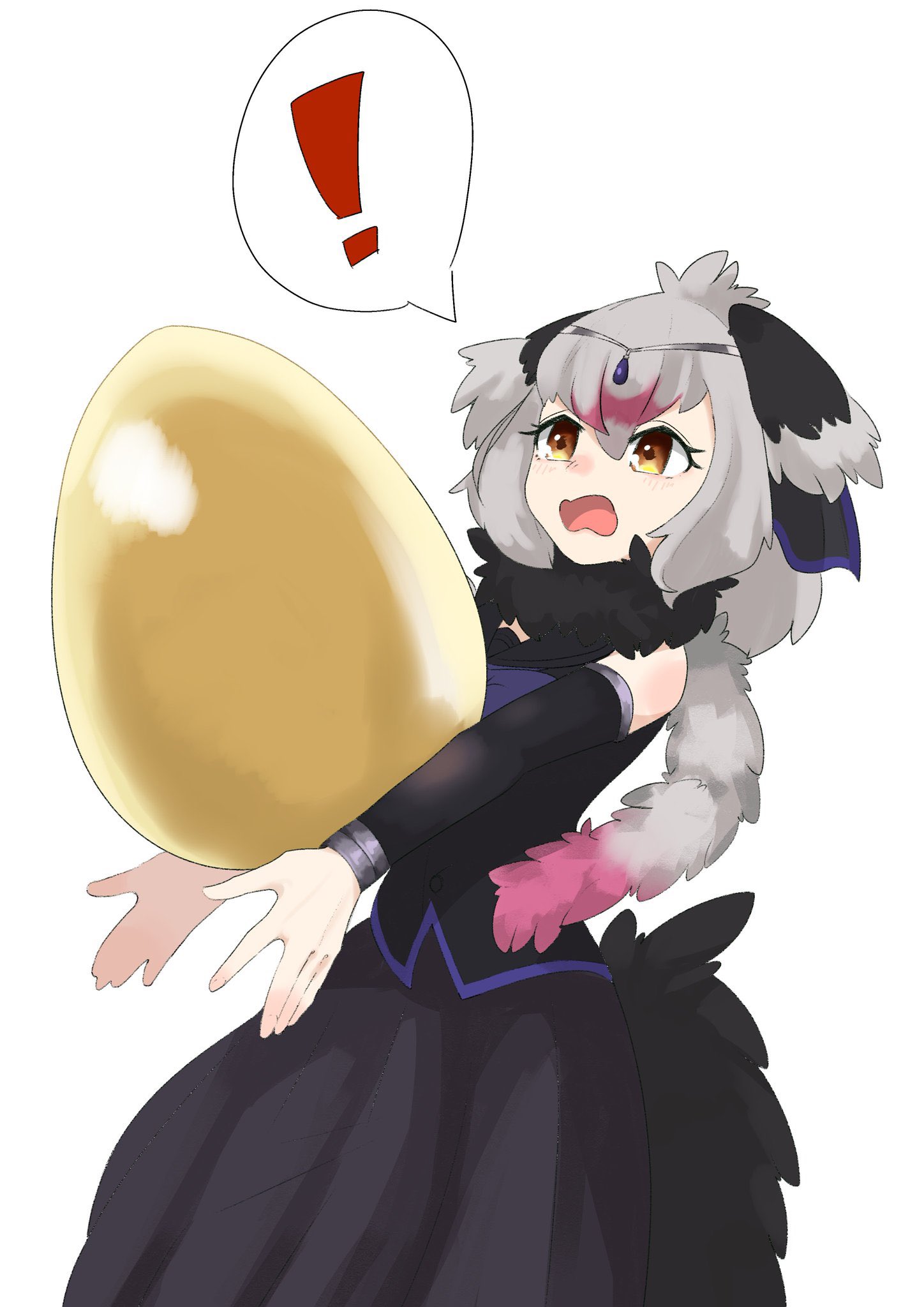 ! 1girl bare_shoulders bird_girl bird_tail bird_wings black_fur black_shirt black_skirt black_sleeves detached_sleeves fur_collar golden_egg hair_between_eyes head_chain head_wings highres jewelry kemono_friends okayu_oziya ostrich_(kemono_friends) pleated_skirt red_hair shirt short_hair sidelocks skirt solo spoken_exclamation_mark tail veil white_hair wings yellow_eyes