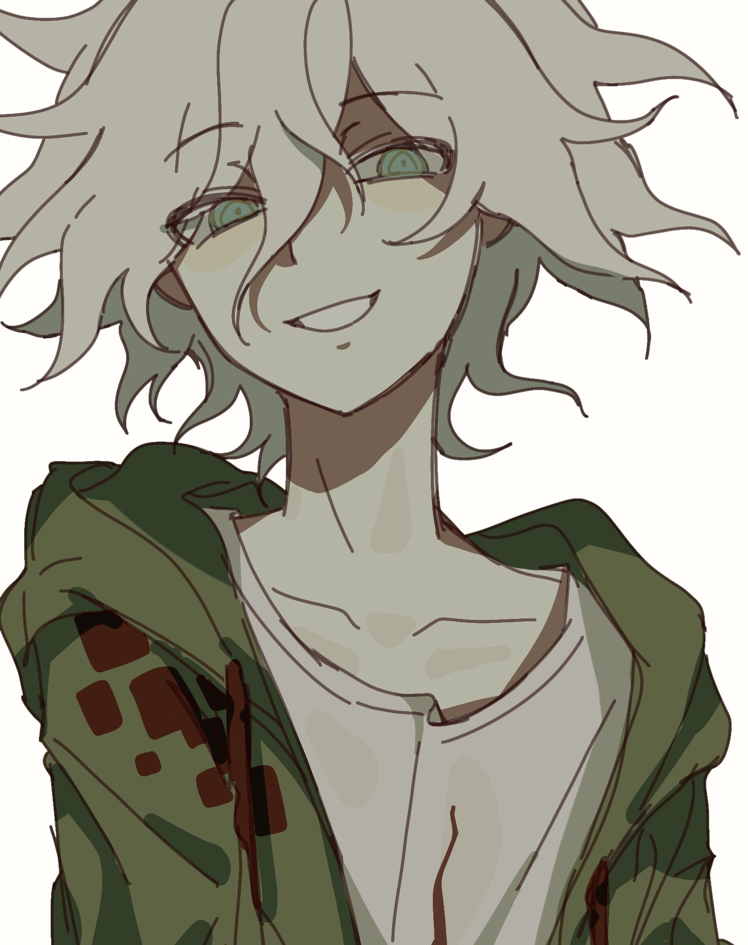 1boy chifurin collarbone danganronpa_(series) danganronpa_2:_goodbye_despair green_jacket grey_eyes grey_hair grey_shirt grin hair_between_eyes highres hood hood_down hooded_jacket jacket komaeda_nagito long_sleeves male_focus medium_hair print_shirt shirt simple_background smile solo teeth upper_body