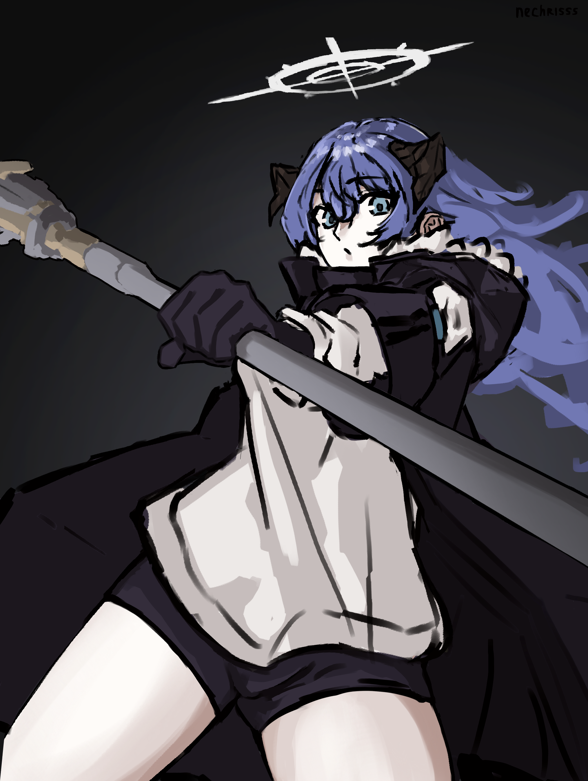 1girl absurdres arknights black_gloves black_jacket blue_eyes blue_hair cowboy_shot demon_horns floating_hair fur-trimmed_jacket fur_trim gloves halo highres holding holding_staff hood hood_down hooded_jacket horns jacket layered_sleeves long_hair long_sleeves looking_at_viewer mostima_(arknights) nechrisss outstretched_arm penguin_logistics_(arknights) shirt short_over_long_sleeves short_shorts short_sleeves shorts solo staff white_shirt