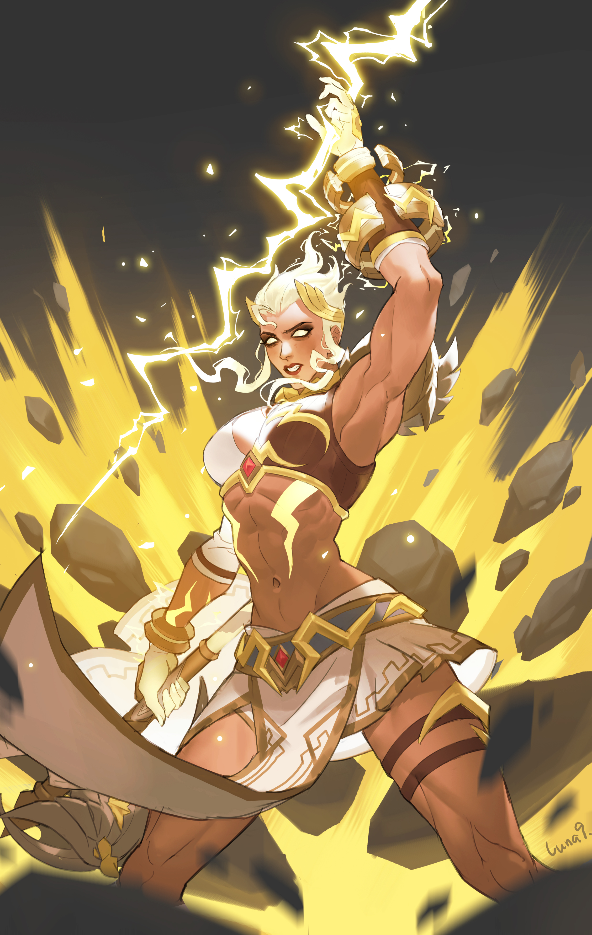 1girl abs absurdres artist_name axe explosion gauntlets glowing glowing_hair glowing_hands glowing_tattoo headpiece highres junker_queen_(overwatch) legband lightning luna-9 navel official_alternate_costume overwatch overwatch_2 single_vambrace skirt tattoo vambraces wristband zeus_junker_queen