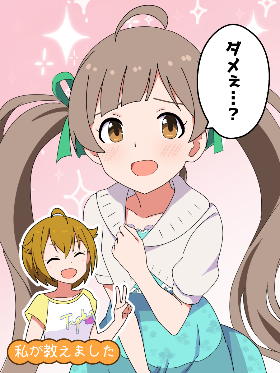 2girls :d ^_^ ahoge aqua_dress blonde_hair brown_eyes brown_hair cardigan closed_eyes commentary dress green_ribbon hair_between_eyes hair_flaps hair_ribbon hakozaki_serika hand_on_own_chest hand_up highres ibuki_tsubasa idolmaster idolmaster_million_live! idolmaster_million_radio! light_blush long_hair looking_at_viewer multiple_girls open_mouth pink_background print_shirt puffy_short_sleeves puffy_sleeves ribbon shirt short_hair short_sleeves smile sparkle_background speech_bubble translated trinitro_(nitro_koubou) twintails upper_body v white_cardigan white_shirt yellow_sleeves