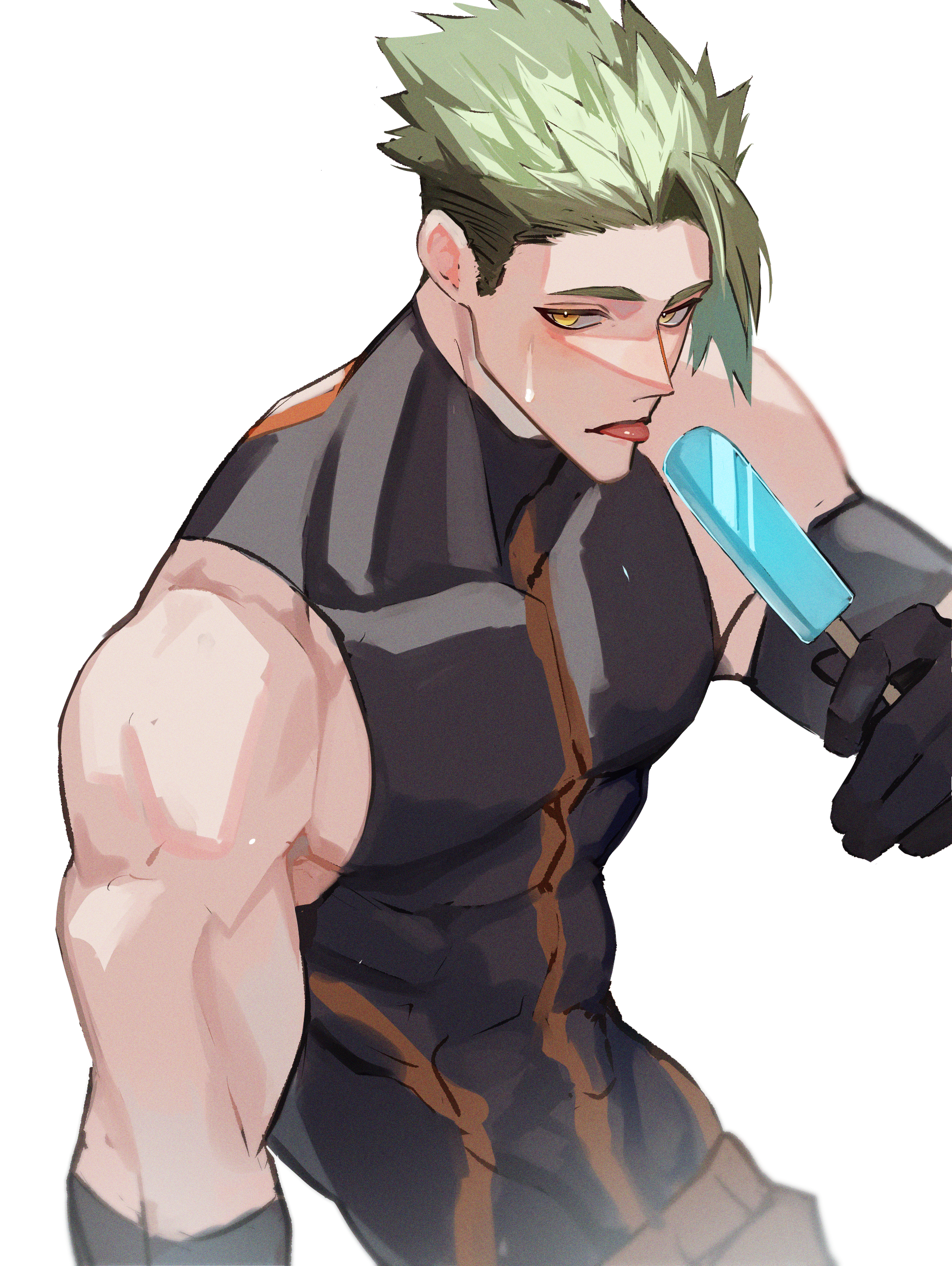 1boy abs absurdres achilles_(fate) achilles_(fearless_diver)_(fate) armband black_armband black_gloves black_shirt collarbone fate/grand_order fate_(series) food gloves green_hair haruakira highres holding holding_food holding_popsicle large_pectorals male_focus pectorals popsicle shirt sidepec simple_background solo sweatdrop tongue tongue_out undercut white_background yellow_eyes