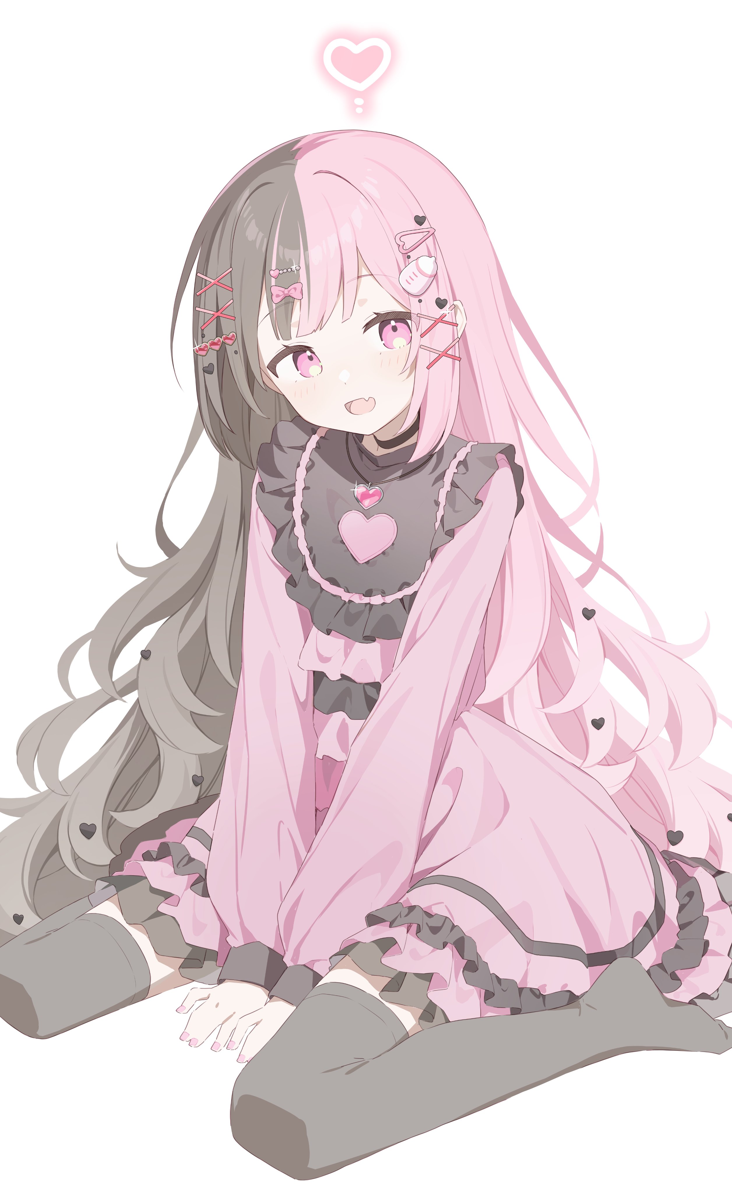 1girl absurdres between_legs black_hair black_thighhighs dress frills hair_ornament hand_between_legs highres jirai_kei long_hair long_sleeves looking_at_viewer multicolored_hair open_mouth original pink_dress pink_eyes pink_hair simple_background sitting solo thighhighs urotsuki_(ku9625) very_long_hair virtual_youtuber wariza wavy_hair white_background yumeru_mirin