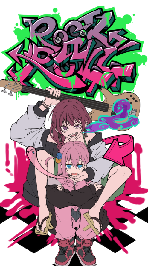 2girls blue_eyes bocchi_the_rock! clog_sandals gotoh_hitori guitar hatori_you hiroi_kikuri instrument multiple_girls pink_hair tears