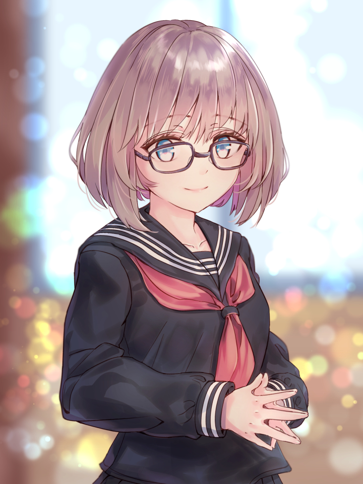 1girl black-framed_eyewear black_serafuku black_shirt black_skirt blue_eyes blurry blurry_background bob_cut bokeh closed_mouth commentary day depth_of_field eyelashes glasses indoors komatsu_(komatsuu123) light_brown_hair long_sleeves looking_at_viewer neckerchief original rectangular_eyewear red_neckerchief school_uniform serafuku shirt short_hair skirt sleeve_cuffs smile solo steepled_fingers striped untranslatable_commentary upper_body winter_uniform