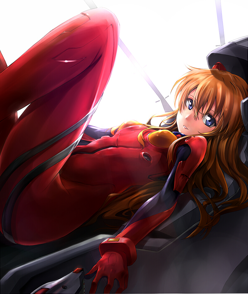 1girl ass bodysuit breasts brown_hair hair_between_eyes hair_ornament long_hair lying mecha_pilot_suit neon_genesis_evangelion oota_takeshi plugsuit_(evangelion) red_bodysuit simple_background skin_tight small_breasts smile solo souryuu_asuka_langley two_side_up vehicle_interior