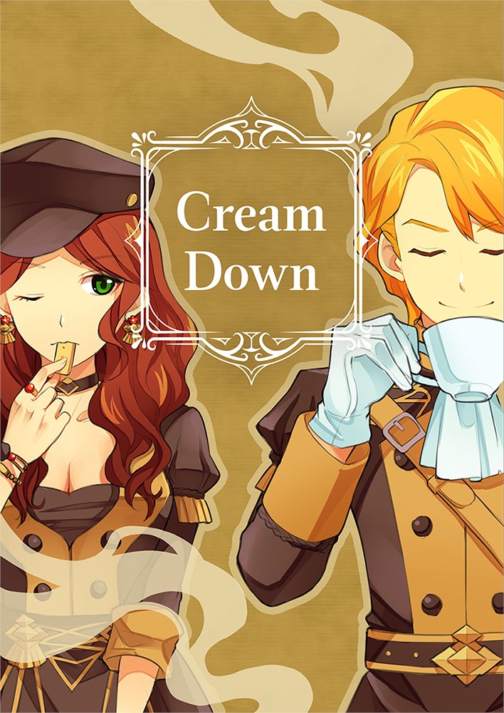 1boy 1girl ane-suisei brown_hair closed_eyes cookie cup dorothea_arnault ferdinand_von_aegir fire_emblem fire_emblem:_three_houses food garreg_mach_monastery_uniform green_eyes hat holding holding_cookie holding_cup holding_food looking_at_another nintendo orange_hair teacup