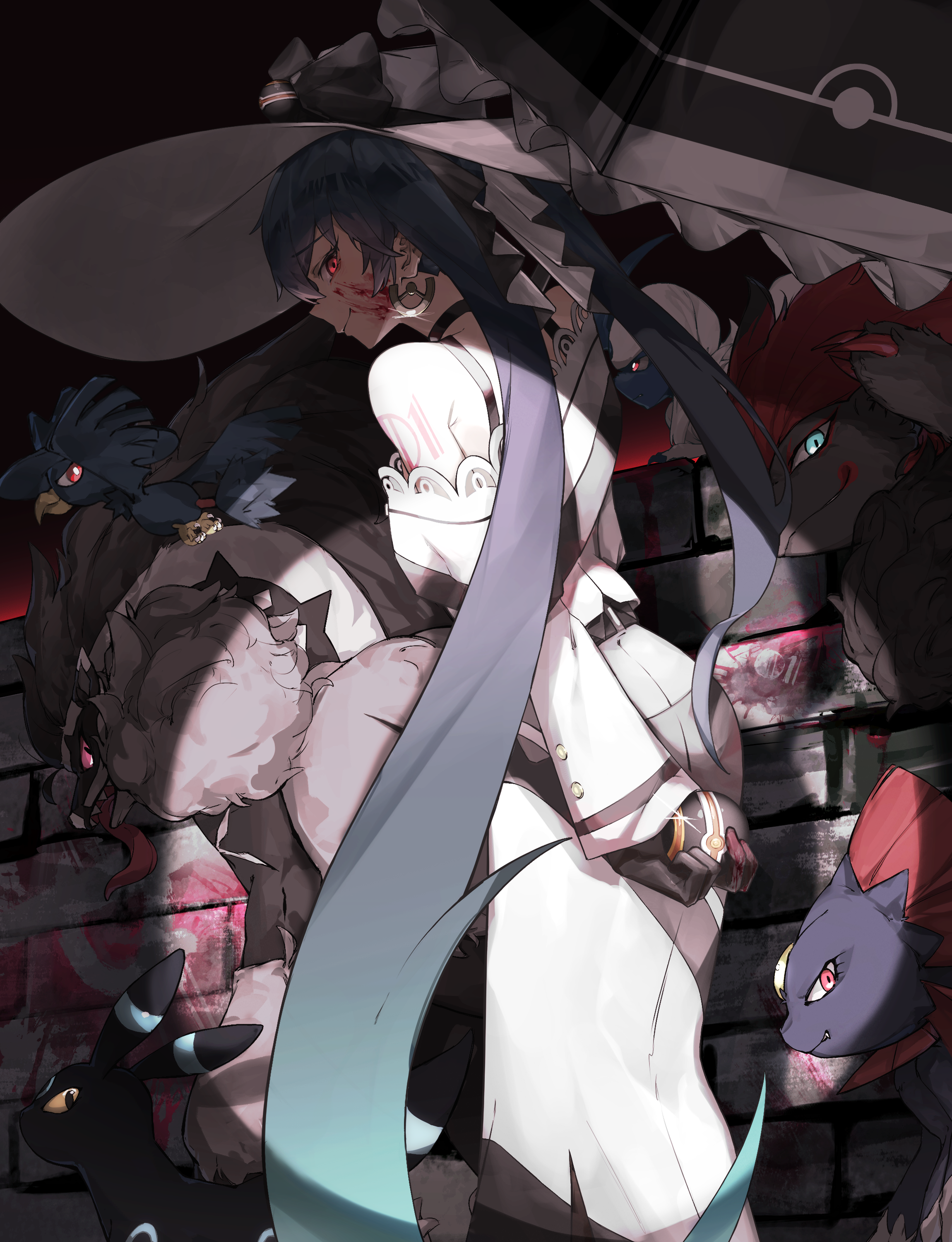 1girl absol absurdres black_bow black_choker black_gloves blood blood_on_face bow choker dark_miku_(project_voltage) earrings gen_2_pokemon gen_3_pokemon gen_4_pokemon gen_5_pokemon gen_8_pokemon gloves green_hair hat hat_bow hatsune_miku highres holding holding_poke_ball holding_umbrella jewelry long_sleeves looking_back luxury_ball momori0118 murkrow nintendo obstagoon off_shoulder poke_ball pokemon pokemon_(creature) project_voltage red_eyes spotlight twintails umbrella umbreon uneven_twintails vocaloid weavile zoroark